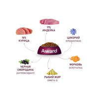 Корм изготовлен из 100% натуральных ингредиентов по инновационной формуле — это обеспечивает комплексную нутрицевтическую поддержку организма питомца. При изготовлении корма использовалась технология 3NRGY — сочетание полезных углеводов, дающее длительный запас энергии и чувство сытости. Корм обогащен полиненасыщенными жирными кислотами, которые повышают качество шерсти и укрепляют иммунитет. Пробиотики и пребиотики помогают сохранять естественный баланс кишечной микрофлоры и способствуют оптимальному усвоению питательных веществ. В состав добавлена морковь — отличный источник клетчатки, улучшающий работу ЖКТ. Без красителей и консервантов. Состав: Дегидрированное мясо курицы 16%, дегидрированное мясо индейки 11%, рис, овес, жир животный (свиной, куриный), чечевица зеленая, гидролизованные мясные белки, витаминно-минеральный комплекс (A, D, E, C, B1, B2, B4, B6, B12, ниацин, пантотеновая кислота, биотин, фолиевая кислота), сухие пивные дрожжи, семена льна, морковь, рыбий жир (лососевый), юкка Шидигера, черная смородина, цикорий, розмарин, пробиотики (Bacillus subtilis, Bacillus licheniformis). Питательная ценность: сырой белок 24%, сырой жир 15%, влага 9%, сырая зола 7,0%, сырая клетчатка 2,5%. Энергетическая ценность (средние значения) на 100г: 378,5 ккал. Витамины и минералы на 1 кг: витамин А 17 000 МЕ/кг, витамин D 900 МЕ/кг, витамин E 350 МЕ/кг, кальций 1,35%, фосфор 1%, цинк 130 мг, медь 10 мг, железо 90 мг, йод 2,5 мг, селен 0,2 мг, натрий 0,3%, калий 0,6%. Добавки на 1 кг: Глюкозамин 350 мг, Хондроитин 100 мг, L-карнитин 150 мг, Омега-3 - 0,45%, Омега-6 - 2,45%. Рекомендуемую ежедневную порцию корма (см. таблицу на упаковке или на сайте) можно разделить на два кормления. Индивидуальные потребности в питании могут отличаться в зависимости от размера, возраста и активности питомца. У собаки всегда должен быть доступ к свежей питьевой воде. Рекомендуется вводить корм в рацион питомца постепенно в течение недели. Корм предназначен исключительно для домашних животных и не предназначен для употребления в пищу человеком. рекомендованная суточная норма кормления, Г/день ВЕС, КГ КОЛ-во, Г 11 186 13 218 15 253 17 279 20 307 23 336 25 362