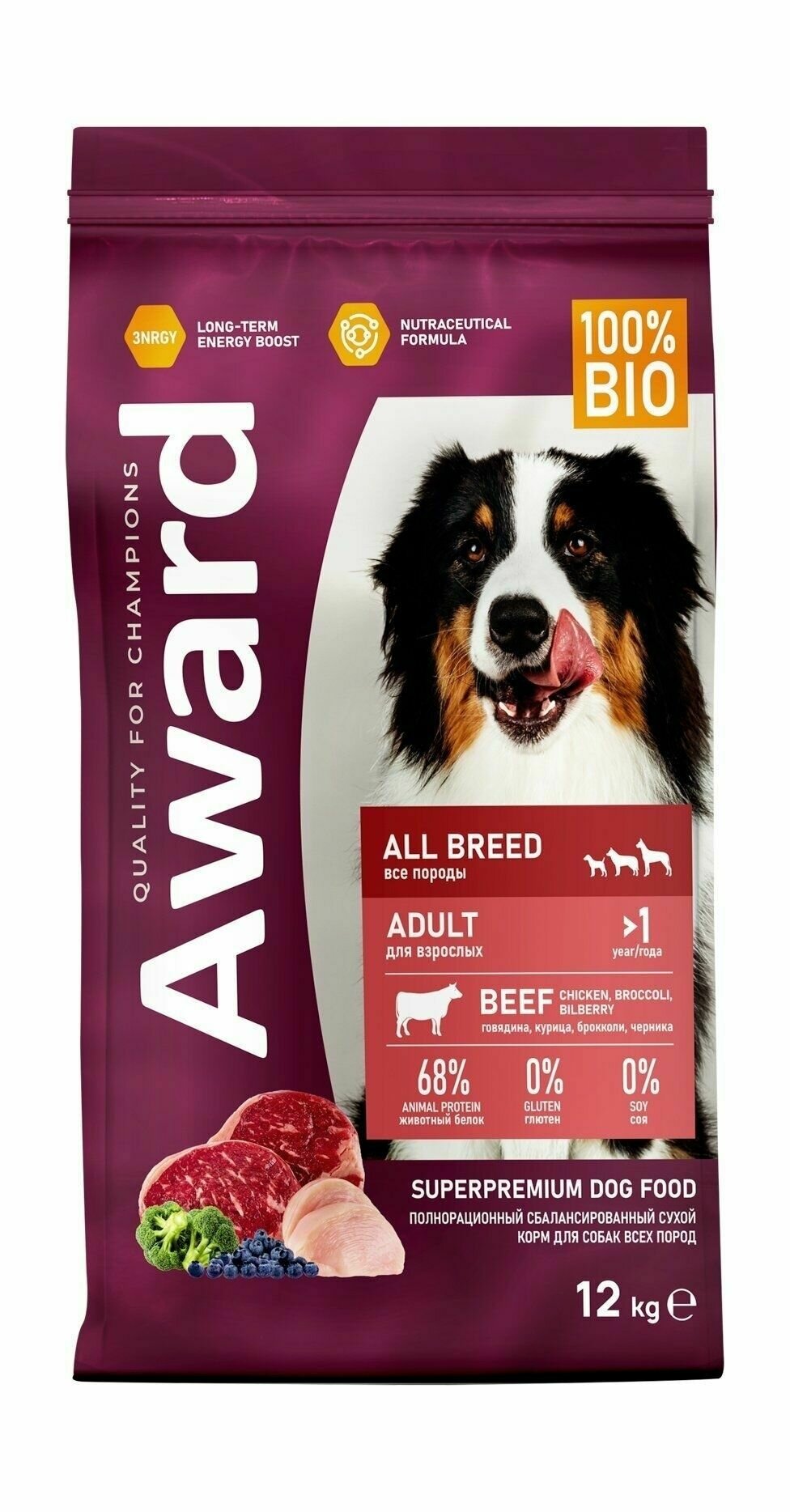 Сухой корм AWARD для взрослых собак всех пород с говядиной и курицей с добавлением брокколи и черники 12 кг.