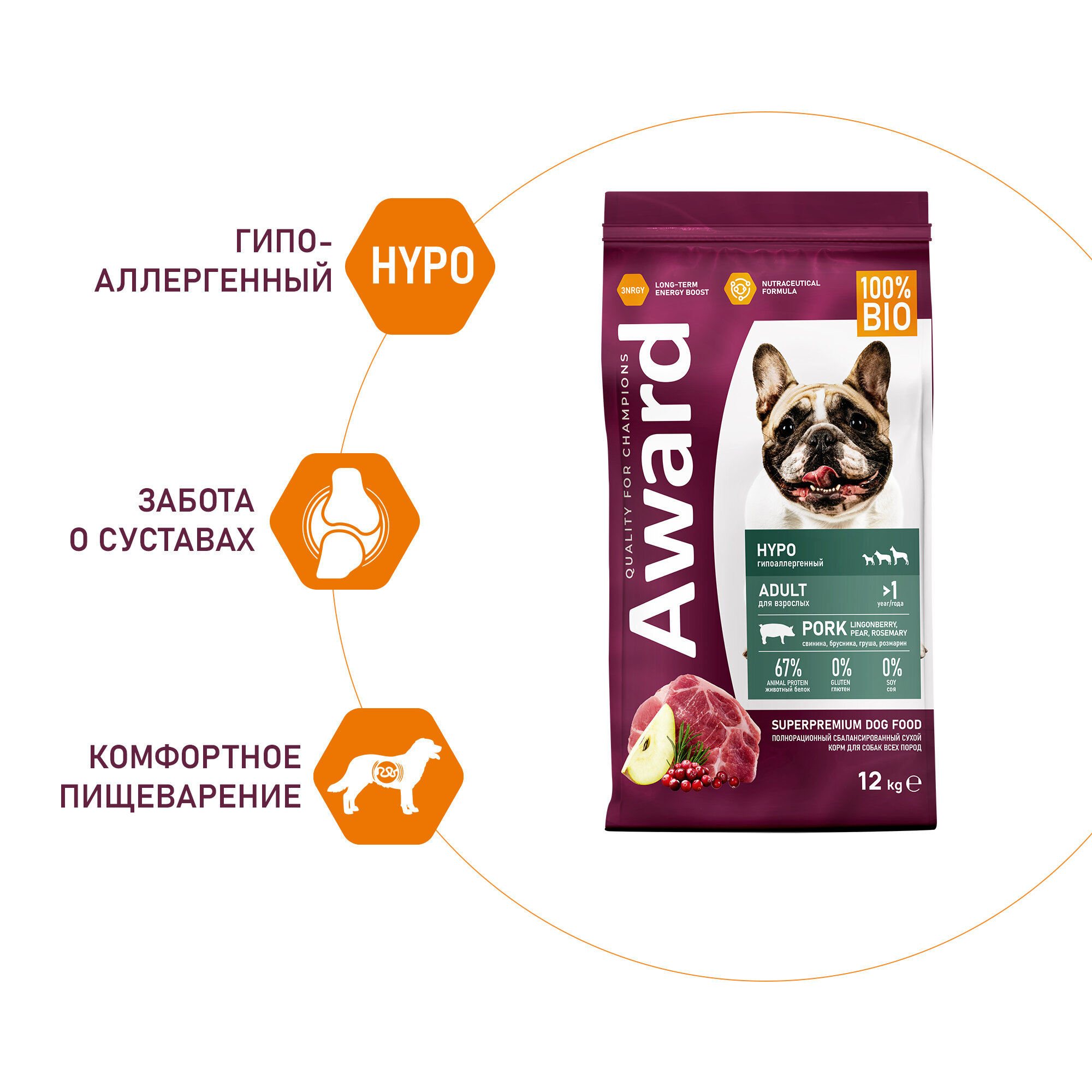 Сухой корм AWARD HYPO для взрослых собак всех пород со свининой с добавлением брусники, груши и розмарина 12 кг. Корм изготовлен из 100% натуральных ингредиентов по инновационной формуле — это обеспечивает комплексную нутрицевтическую поддержку организма питомца. Подойдет для для собак всех пород с повышенной чувствительностью к компонентам корма. Источник белка — свинина, источник углеводов — рис. При изготовлении корма использовалась технология 3NRGY — сочетание полезных углеводов, дающее длительный запас энергии и чувство сытости. Корм обогащен полиненасыщенными жирными кислотами, которые повышают качество шерсти и укрепляют иммунитет. Пробиотики и пребиотики помогают сохранять естественный баланс кишечной микрофлоры и способствуют оптимальному усвоению питательных веществ. Без красителей и консервантов.