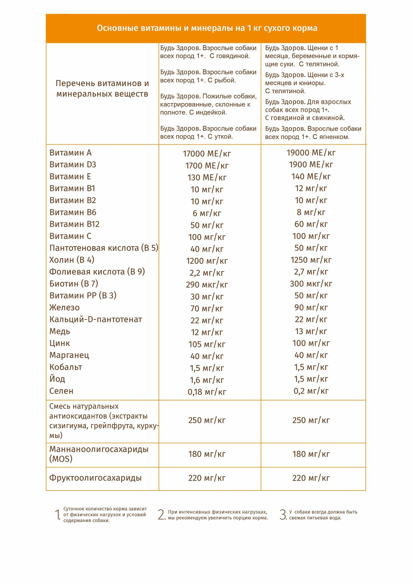 Пищевая ценность: протеин 21 %, жир 11 %, клетчатка 2,5 %, влажность 10 %, минеральные вещества 3,8 %, зола 7 %, доля жирных кислот омега-3 2,2 %, омега -6 1,9 %, кальций 1,65 %, фосфор 0,95 %, глюкозамин 1100 мг/кг, хондроитин 900 мг/кг, обменная энергия на 1 кг корма – 3200 ккал, витамины и минералы см. таблицу.