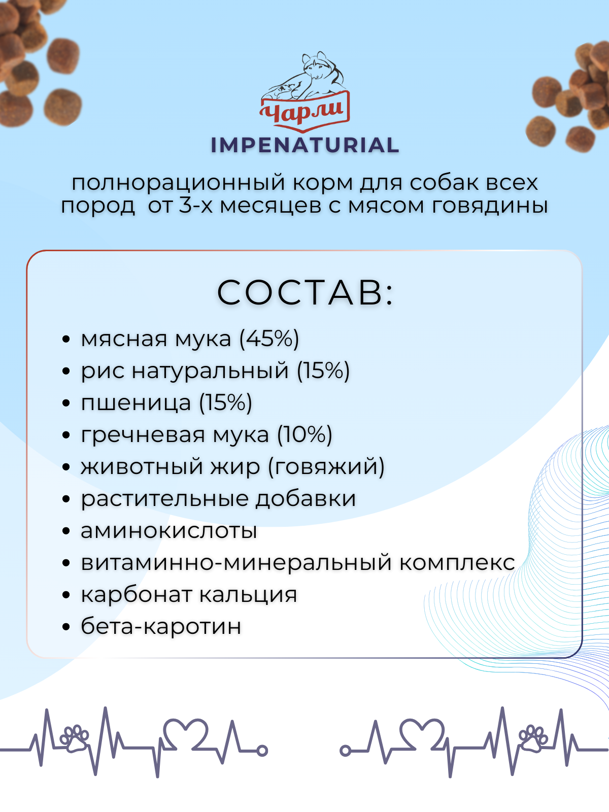 Сухой корм Чарли для собак всех видов пород от 3-х месяцев с говядиной Империал 10кг: сравнение цен, характеристики, фото, актуальное наличие и цены.