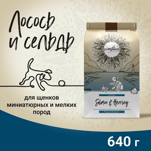 CRAFTIA NATURA сухой корм для щенков миниатюрных и мелких пород из лосося и сельди CRAFTIA NATURA — корм для собак ультрапремиум класса, созданный с любовью к природе. Состав кормов CRAFTIA прозрачен и понятен, отсутствуют скрытые добавки и сомнительные ингредиенты. Все, что заявлено в составе корма, гарантированно присутствует в каждой грануле. Собственный завод, сотни квадратных метров научно-исследовательских лабораторий, первоклассное сырье — все это позволяет создавать тщательно сбалансированный высокобелковый корм корм с холистическим подходом. Все компоненты корма подходят для употребления человеком и не содержат ГМО. Продукт соответствует высоким стандартам качества и имеет следующие сертификаты соответствия: HACCP, ISO 9001, ISO 14001, ISO 18001, ISO 45001, DQS, IFS. Ингредиент №1 — свежее мясо. Это лучший источник белка из возможных. Кроме того, он делает вкус корма очень привлекательным для питомцев. Запатентованная формула NUTRIBIOME — тщательно подобранная смесь пребиотиков, клетчатки, мультивитаминов, антиоксидантов. Функциональные добавки — Омега-6 и Омега-3, глюкозамин, хондроитин. Жирные кислоты помогают поддерживать здоровье кожи и шерсти, играют важную роль в поддержании здоровья сердечно-сосудистой системы, обладают противовоспалительными свойствами. Глюкозамин и хондроитин способствуют здоровью суставов, восстанавливают хрящевую Бурые водоросли ASCOPHYLLUM NODOSUM уменьшают зубной налет, неприятный запах, кровоточивость десен, сокращают образование зубного камня. Получается, что во время еды питомец одновременно чистит зубы: Ascophyllum nodosum размягчает зубной налет, а при жевании сухих гранул этот налет механически удаляется. 0% искусственных красителей, ароматизаторов, консервантов. 0% ГМО. 0% химической обработки сырья. Основные источники белка в корме — лосось и сельдь. Они богаты незаменимыми Омега-3 жирными кислотами и минеральными веществами. Жирные кислоты контролируют воспалительные процессы в организме, что хорошо влияет на здоровье суставов. Легкоусвояемый рыбный белок способствует формированию крепкой мускулатуры, улучшает состояние кожи. Источники углеводов — спельта, бурый рис, ячмень, овес и просо. Специально подобраны злаки с разным гликемическим индексом, чтобы питомец дольше чувствовал себя сытым: глюкоза поступает в организм постепенно, а значит, чувство голода не наступает дольше. Источники клетчатки — свекольная пульпа, волокна гороха и люцерновая мука. Свекольная пульпа способствует здоровью слизистой кишечника, гороховая клетчатка стимулирует перистальтику, а люцерновая мука способствует размножению полезной микрофлоры кишечника. Суперфуды в корме — спаржа, черника, клюква, ацерола и многие другие. Суперфуды являются источниками витаминов, биологически активных компонентов и обладают антиоксидантными свойствами. Попробуйте Craftia, ощутите уверенность в качестве корма своего питомца — и наслаждайтесь жизнью в гармонии с природой!