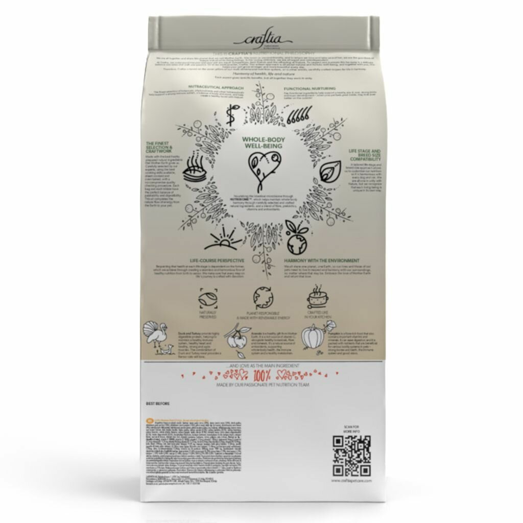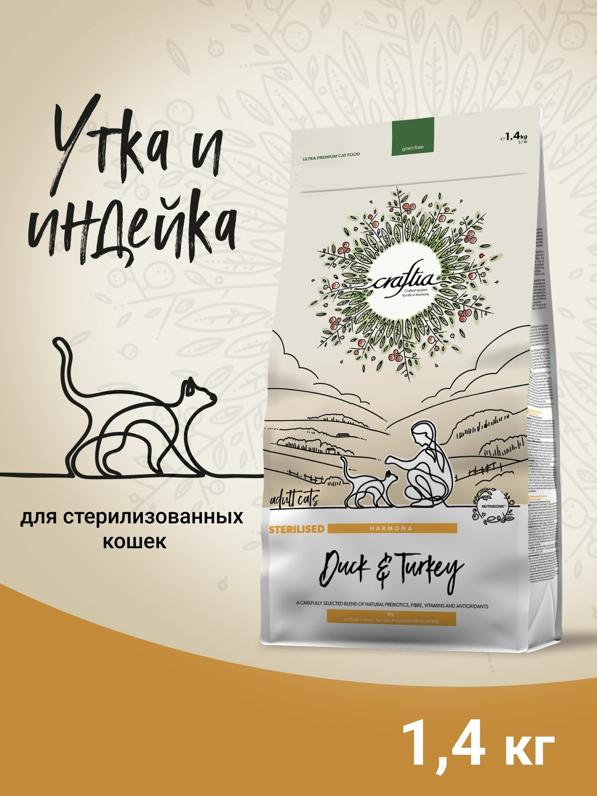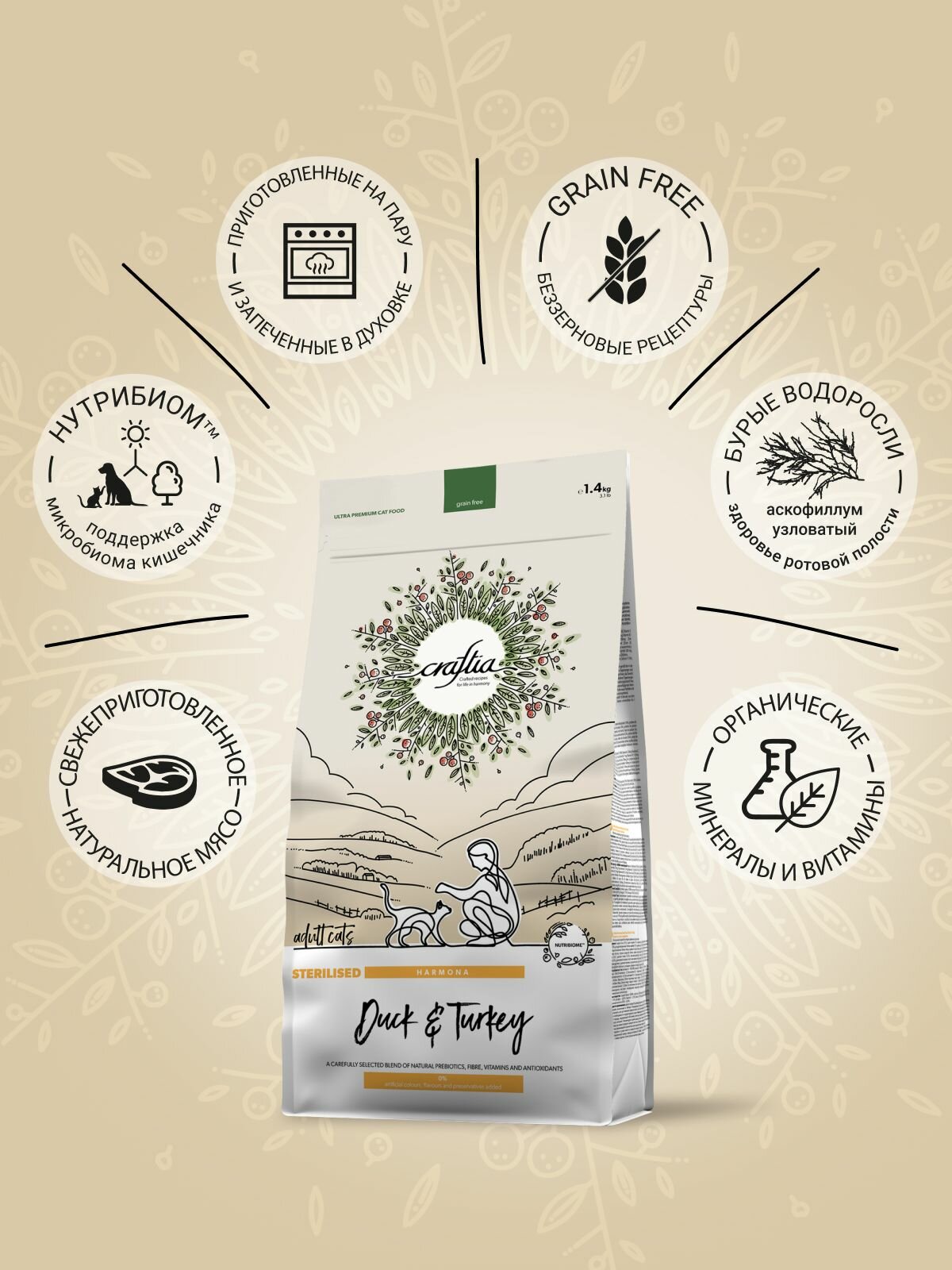 CRAFTIA HARMONA сухой корм для стерилизованных кошек из утки и индейки CRAFTIA NATURA — корм для собак ультрапремиум класса, созданный с любовью к природе. Состав кормов CRAFTIA прозрачен и понятен, отсутствуют скрытые добавки и сомнительные ингредиенты. Все, что заявлено в составе корма, гарантированно присутствует в каждой грануле. Собственный завод, сотни квадратных метров научно-исследовательских лабораторий, первоклассное сырье — все это позволяет создавать тщательно сбалансированный высокобелковый корм с холистическим подходом. Все компоненты корма подходят для употребления человеком и не содержат ГМО. Продукт соответствует высоким стандартам качества и имеет следующие сертификаты соответствия: HACCP, ISO 9001, ISO 14001, ISO 18001, ISO 45001, DQS, IFS. Ингредиент №1 — свежее мясо. Это лучший источник белка из возможных. Кроме того, он делает вкус корма очень привлекательным для питомцев. Запатентованная формула NUTRIBIOME — тщательно подобранная смесь пребиотиков, клетчатки, мультивитаминов, антиоксидантов. Функциональные добавки — Омега-6 и Омега-3, глюкозамин, хондроитин. Жирные кислоты помогают поддерживать здоровье кожи и шерсти, играют важную роль в поддержании здоровья сердечно-сосудистой системы, обладают противовоспалительными свойствами. Глюкозамин и хондроитин способствуют здоровью суставов, восстанавливают хрящевую ткань. Бурые водоросли ASCOPHYLLUM NODOSUM уменьшают зубной налет, неприятный запах, кровоточивость десен, сокращают образование зубного камня. Получается, что во время еды питомец одновременно чистит зубы: Ascophyllum nodosum размягчает зубной налет, а при жевании сухих гранул этот налет механически удаляется. 0% искусственных красителей, ароматизаторов, консервантов. 0% ГМО.0% химической обработки сырья. Основные источники белка в корме — свежее мясо утки и индейки. Комбинация этих белков легко переваривается, помогает поддерживать оптимальный вес питомца, стабилизирует обмен веществ. Утка и индейка — отличные источники незаменимых аминокислот, витаминов и минералов. Исключен распространенный аллерген — курица. Источники углеводов — предварительно обработанные гороховый крахмал и экстракт семян киноа. Эти компоненты имеют низкий гликемический индекс, а значит — питомец дольше чувствует себя сытым и не переедает. Источники клетчатки — свекольная пульпа, волокна гороха и люцерновая мука. Свекольная пульпа способствует здоровью слизистой кишечника, гороховая клетчатка стимулирует перистальтику, а люцерновая мука способствует размножению полезной микрофлоры кишечника. Суперфуды в корме — спаржа, черника, клюква, ацерола и многие другие. Суперфуды являются источниками витаминов, биологически активных компонентов и обладают антиоксидантными свойствами. Попробуйте Craftia, ощутите уверенность в качестве корма своего питомца — и наслаждайтесь жизнью в гармонии с природой!