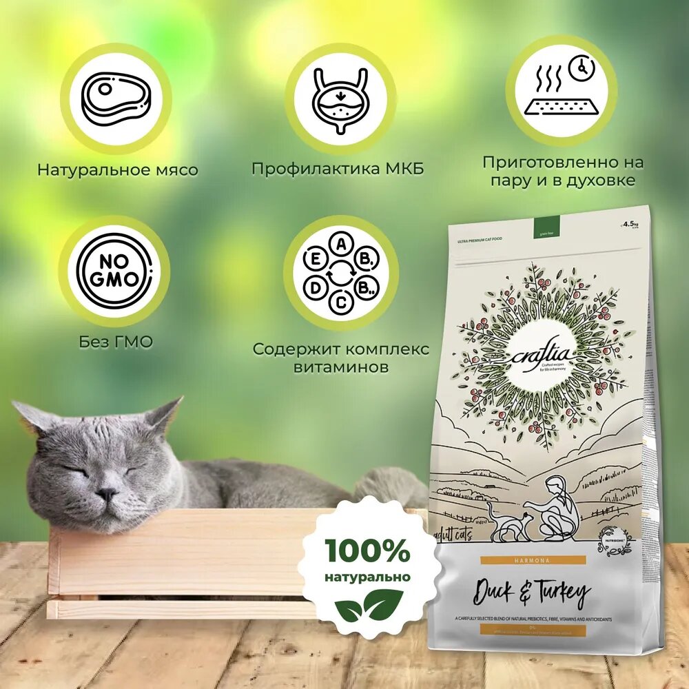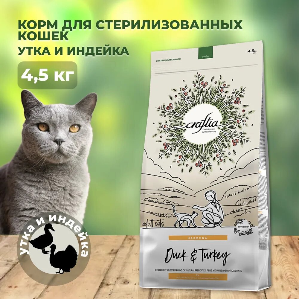 Купить Сухой корм CRAFTIA HARMONA для стерилизованных кошек из утки и индейки 4,5 кг с доставкой по всей России. Сухой корм CRAFTIA HARMONA для стерилизованных кошек из утки и индейки 4,5 кг: сравнение цен, характеристики, фото, актуальное наличие и цены.