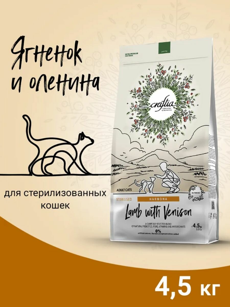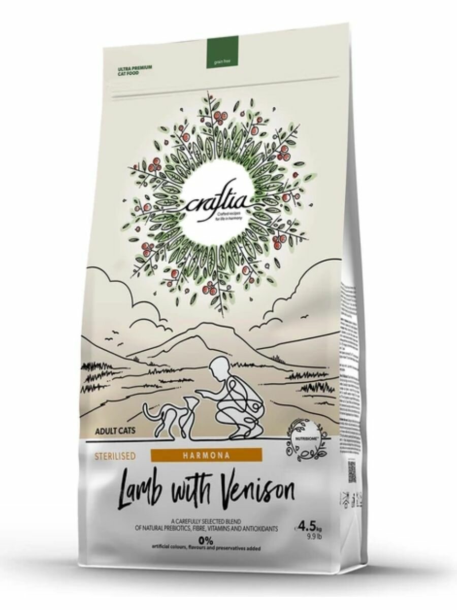 CRAFTIA HARMONA — корм для кошек ультрапремиум класса, созданный с любовью к природе. Состав кормов CRAFTIA прозрачен и понятен, отсутствуют скрытые добавки и сомнительные ингредиенты. Все, что заявлено в составе корма, гарантированно присутствует в каждой грануле. Собственный завод, сотни квадратных метров научно-исследовательских лабораторий, первоклассное сырье — все это позволяет создавать тщательно сбалансированный высокобелковый корм с холистическим подходом. Все компоненты корма подходят для употребления человеком и не содержат ГМО.