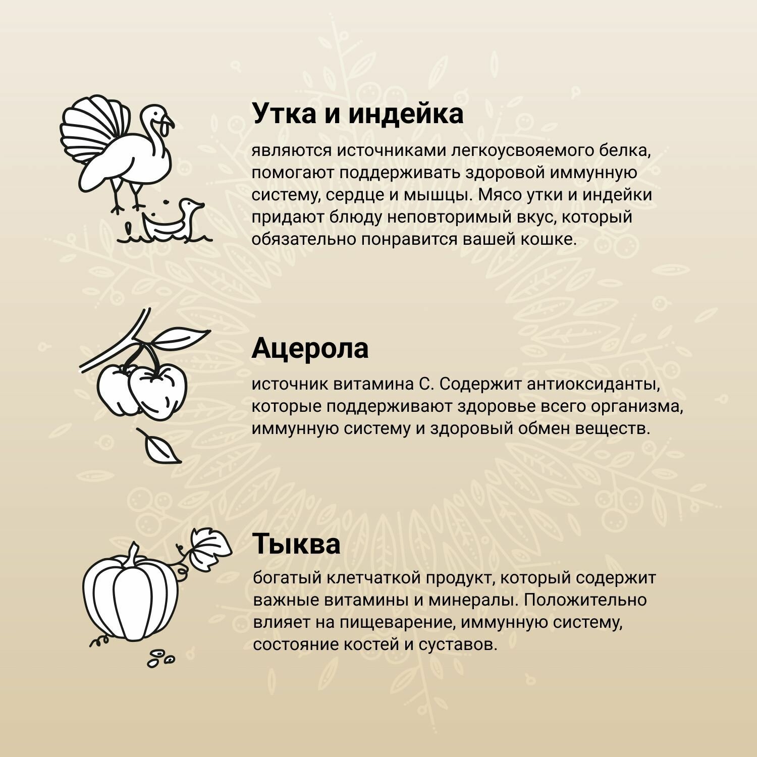 Основные источники белка в корме — свежее мясо утки и индейки. Комбинация этих белков легко переваривается, помогает поддерживать оптимальный вес питомца, стабилизирует обмен веществ. Утка и индейка — отличные источники незаменимых аминокислот, витаминов и минералов. Исключен распространенный аллерген — курица.