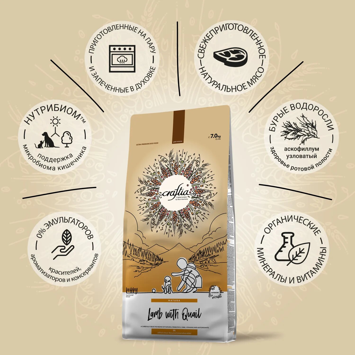 Сухой корм CRAFTIA NATURA для щенков миниатюрных и мелких пород из ягненка с перепелкой 7 кг: сравнение цен, характеристики, фото, актуальное наличие и цены.