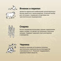 Основные источники белка в корме — свежее мясо ягненка и перепелки. Это редко встречающиеся ингредиенты, поэтому они подходят животным, склонным к возникновению аллергических реакций. Ягненок и перепелка — отличные источники незаменимых аминокислот, витаминов и минералов. Они легко усваиваются, помогают поддерживать оптимальный вес питомца, стабилизируют обмен веществ.
