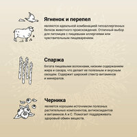 Основные источники белка в корме — свежее мясо ягненка и перепелки. Это редко встречающиеся источники белка, поэтому они подходят животным, склонным к возникновению аллергических реакций. Ягненок и перепелка — отличные источники незаменимых аминокислот, витаминов и минералов. Они легко усваиваются, помогают поддерживать оптимальный вес питомца, стабилизируют обмен веществ.