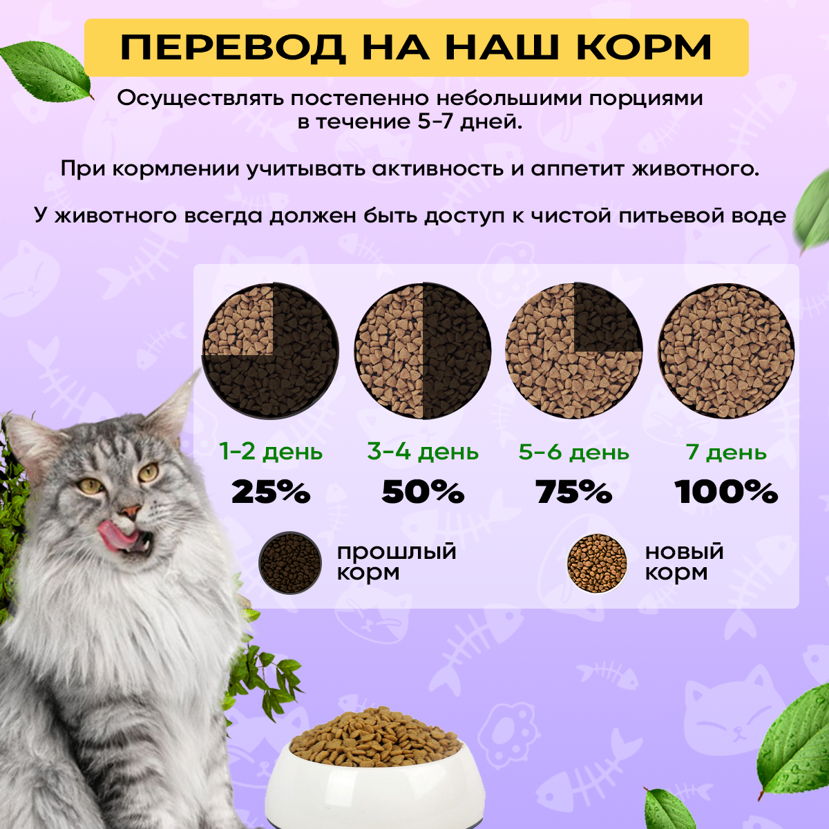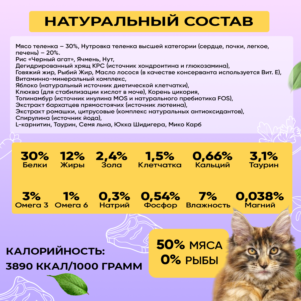 Белок – 30%. Жир – 12%. Клетчатка – 1,5%. Зола – 2,4%. Кальций – 0,66%. Фосфор – 0,54%. Натрий – 0,30%. Калий – 0,28%. Омега 3 – 3%. Омега 6 – 1%. Влажность – 7%.