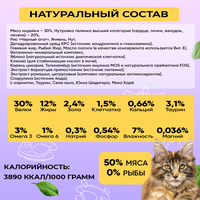 Белок – 30%, Жир – 12%, Клетчатка – 1,5%, Зола – 2,4%, Кальций – 0,66%, Фосфор – 0,54%, Натрий – 0,30%, Калий – 0,28%, Омега 3 – 3%, Омега 6 – 1%, Влажность – 7%.