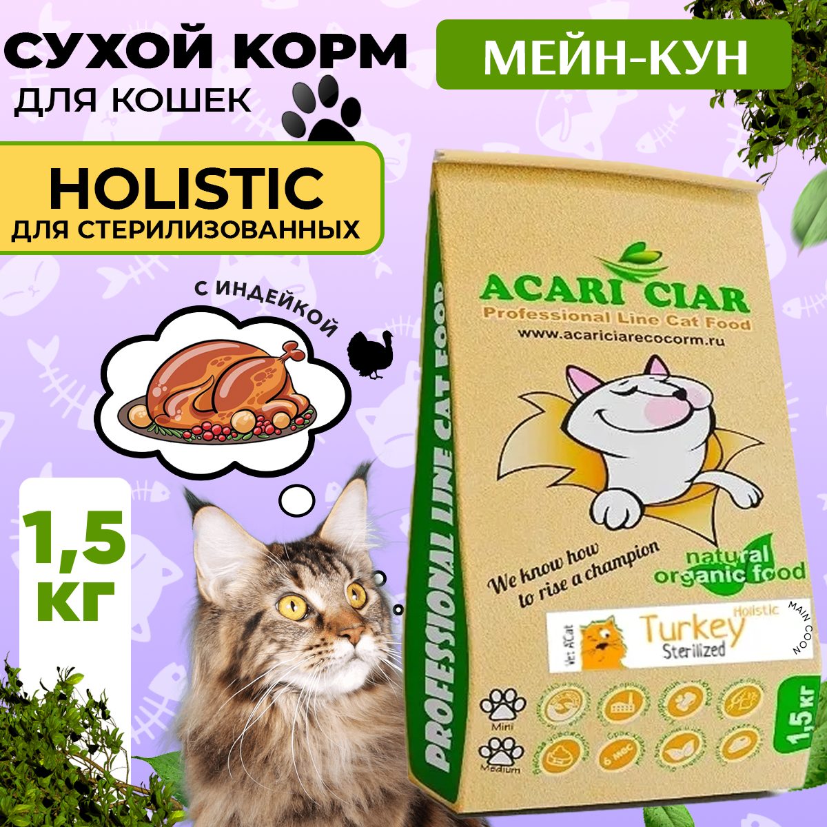 Акари Киар ВЕТ А`КЭТ мейн-кун стирилайзед Индейка. Сбалансированный сухой корм класса холистик с индейкой для взрослых стерилизованных кошек и котов.