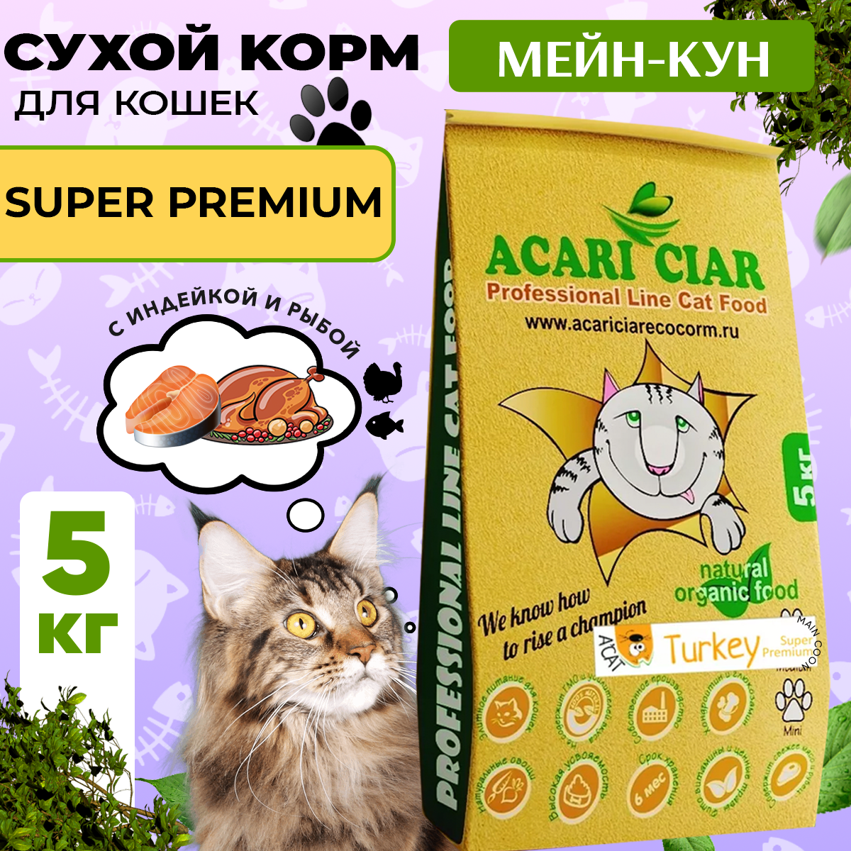 Сбалансированный сухой корм класса Холистик с мясом индейки для взрослых кошек и котов породы Мейн Кун.