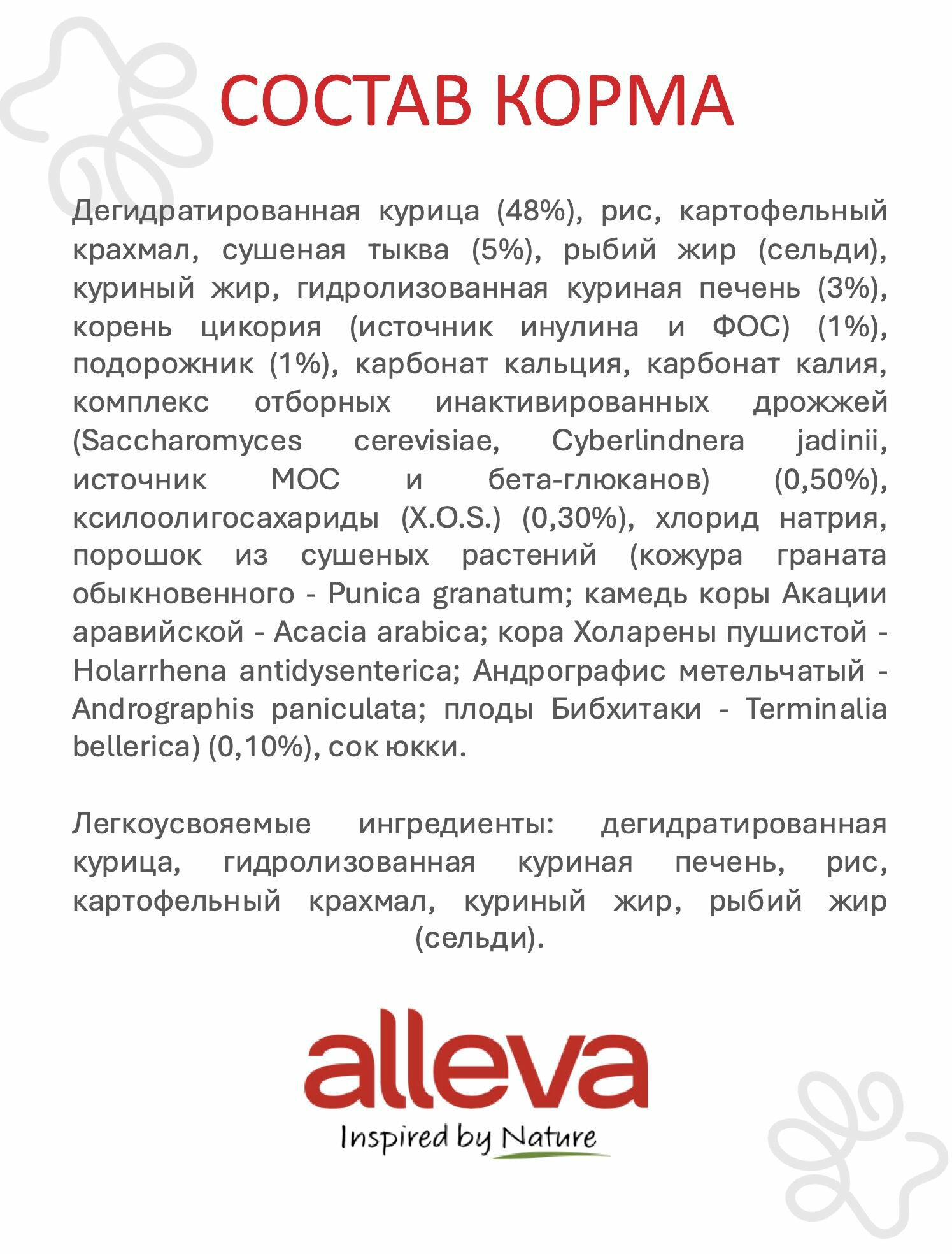 Все элитные корма Alleva имеют идеально сбалансированный состав на основе натуральных компонентов — злаков, ягод, овощей, фруктов, натуральных белков и легкоусвояемых углеводов, витаминных и минеральных комплексов, антиоксидантов. Питание с использованием кормов Alleva гарантирует благотворное влияние на все системы органов домашнего питомца — улучшается иммунитет, работа пищеварительной системы, шерсть приобретает блеск и густоту, повышается общее самочувствие и настроение животного. Alleva Care Gastrointestinal Low Fat