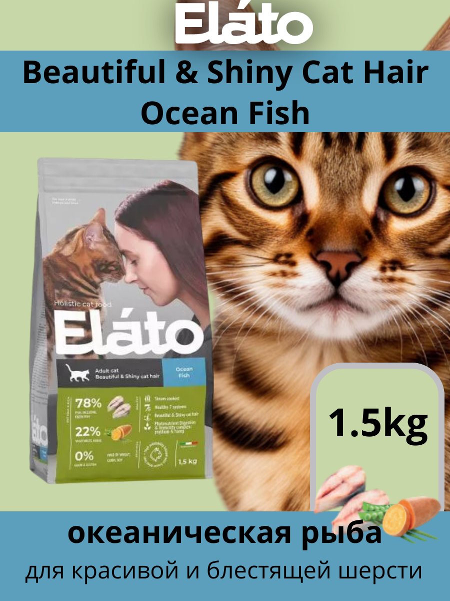 Корм Elato Holistic для взрослых кошек с рыбой / для красивой и блестящей шерсти поддерживает здоровое состояние 7-и важных систем организма, придает шерсти блеск и ухоженный вид за счет высокого содержания незаменимых жирных кислот Омега-3, укрепляет иммунитет благодаря конопле посевной, псиллиуму и полному комплексу витаминов.