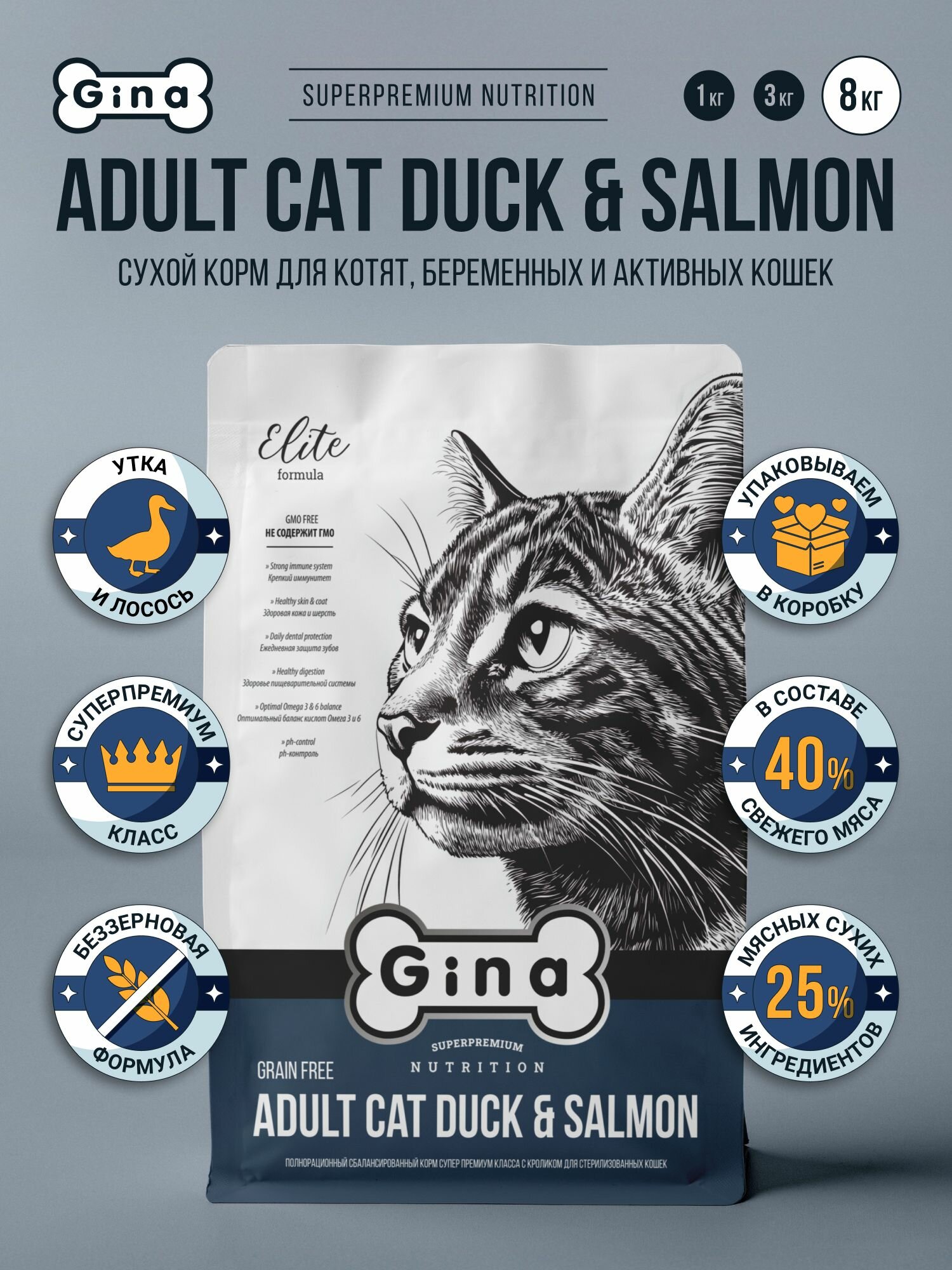 Купить Сухой корм для кошек Gina Elite беззерновой с уткой и лососем, супер премиум, для умеренно активных, 8кг, GF Cat Duck & Salmon с доставкой по всей России.