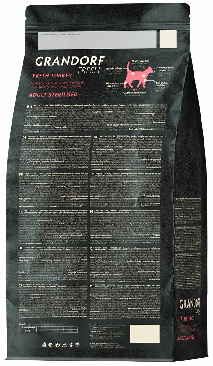 | Дополнительная информация | не содержит: кукурузу, пшеницу, свеклу, горох, субпродукты, яйца, курицу, куриный жир, соль, сахар, красители, ароматизаторы, сою и гмо; страна производитель: Бельгия |