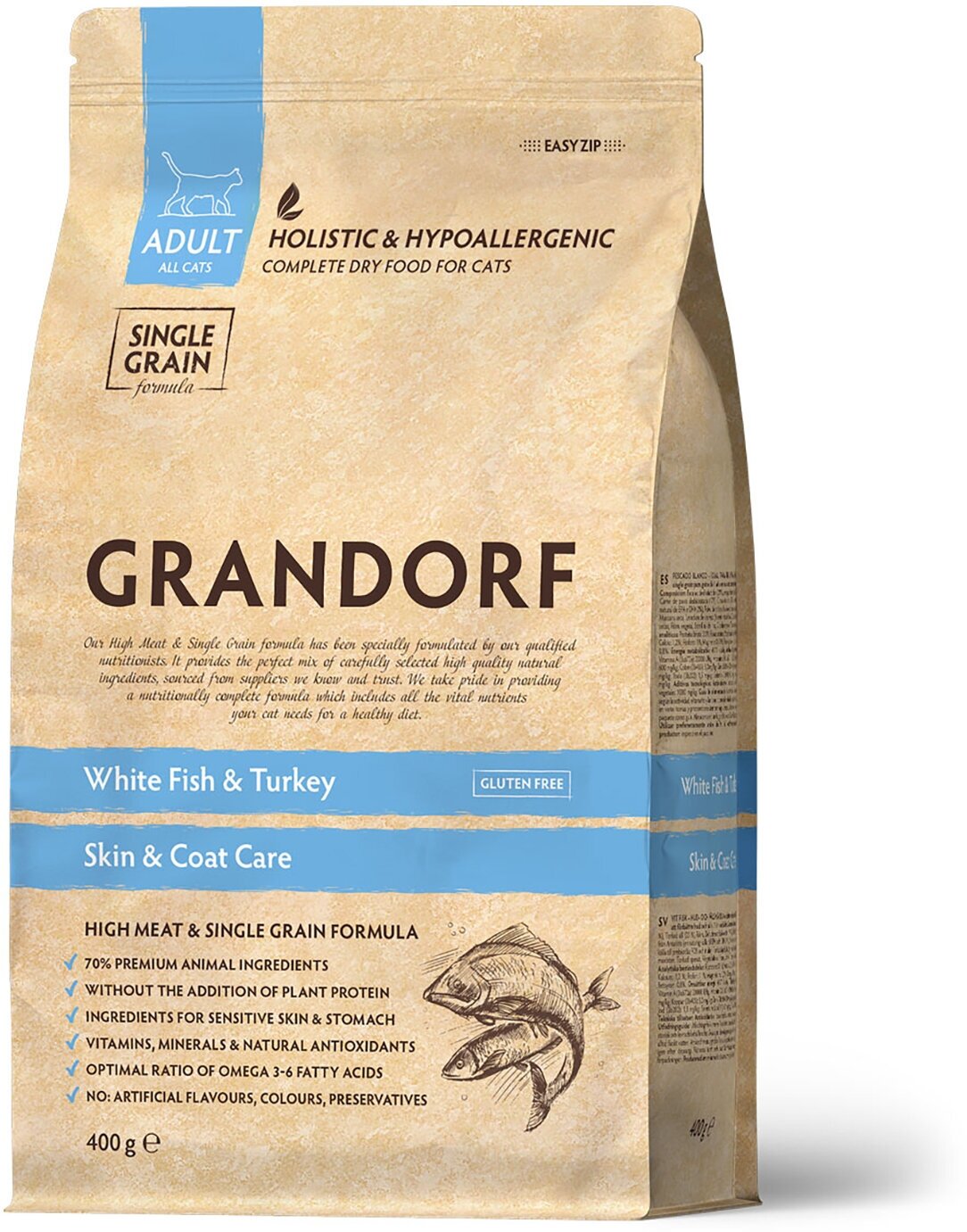Белая рыба с индейкой Indoor Для кошек с чувствительной кожей и шерстью, ослабленным пищеварением или склонных к аллергии на зерновые. особая забота о коже и шести / профилактика мочекаменной болезни / чувствительное пищеварение Формула богата мясом океанических рыб, насыщена Омега-6, Омега-3 и необходимыми аминокислотами. Идеальна для питомцев, требующих особого внимания и ухода за кожей и шерстью, а также питомцев с чувствительным пищеварением или склонных к аллергии. 70% мяса в составе Низкозерновой состав Два источника животного белка Гипоаллергенные ингредиенты 33% белки, 16% жиры Не содержит: пшеницу, кукурузу, свеклу, горох, субпродукты, яйца, курицу, куриный жир, соль, сахар, красители, ароматизаторы, сою и ГМО. Низкозерновой состав и натуральные гипоаллергенные ингредиенты в сочетании с диетическим мясом белой рыбы, помогают предотвратить аллергические реакции и пищевую непереносимость, обеспечивая иммунное и пищеварительное здоровье. Деликатный способ приготовления сохраняет все полезные свойства и питательные вещества натуральных ингредиентов и обеспечивают отличное физическое состояние и долгую здоровую жизнь питомца. Преимущества: • 70% мяса в составе корма • Только животные белки • Только гипоаллергенные ингредиенты • Только мясо без субпродуктов • Комплекс хондропротекторов • Баланс соотношения Omega 6-3 • Контроль уровня кислотности рН • Низкий уровень золы в составе • Натуральные антиоксиданты • Бережный способ приготовления Состав: Дегидрированная треска (23%), Дегидрированная сельдь (23%), Цельнозерновой коричневый рис, Дегидрированное мясо индейки (17%), Жир индейки (5%), Сушеный антарктический криль (натуральный источник ЭПК и ДГК, 2%), Порошок корней цикория (натуральный источник пребиотиков: ФОС и инулин), Сушеное яблоко, Пивные дрожжи (натуральный источник МОС), Сушеная морковь, Сушеный шпинат, Растительная клетчатка, Льняное семя, Сушеная клюква, Юкка Мохаве. Кроме заявленных в составе животных ингредиентов продукт может содержать следы ДНК других ингредиентов животного или растительного происхождения в незначительных количествах из-за технологических особенностей производства кормов. Аналитические составляющие: Сырой протеин: 33%; Сырая клетчатка: 2,5%; Сырой жир: 16%; Сырая зола: 7,5%; Влажность: 6%; Кальций: 1,2%; Фосфор: 1%; Магний: 0,09%; Омега 6 жирные кислоты: 3,5%; Омега 3 жирные кислоты: 0,8%. Метаболизируемая энергия: 4171 ккал/кг. Добавки/кг: Пищевые добавки: Витамин А (3a672a): 20000 МЕ/кг; Витамин D3 (3a671): 1500 МЕ/кг; Витамин Е (3a700): 600 мг/кг; Медь (3b405): 5,0 мг/кг; Цинк (3b605): 100 мг/кг; Марганец (3b503): 15 мг/кг; Йод (3b202): 1,5 мг/кг; Селен (3b801): 0,2 мг/кг; Таурин (3a370): 1500 мг/кг. Технологические добавки: Антиоксидант: богатые токоферолом экстракты из растительных масел 1000 мг/кг.