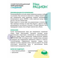 Сухой корм Наш Рацион для кошек Отличие корма среднего сегмента Наш Рацион для кошек от аналогов:* Используется мясное сырье высокого качества. Корм не содержит мясокостную муку.* При небольшой белковой ценности сохраняется его максимальная усвояемость организмом, благодаря увеличению на 30% количества жирорастворимых витаминов от минимально рекомендуемых для кормов среднего сегмента и добавлению синбиотиков.* Содержание в составе уникальной добавки ProStor Bio Care.* Корм обогащен необходимыми витаминами для полноценной жизнедеятельности:* Витамин А (каротин) - необходим для поддержания здоровья глаз, кожи и шерсти питомца.* Витамин Д3 необходим для здоровья костей.* Витамин Е - участвует в регенерации клеток кожи и шерсти и нормализует половые функции животного.* Селен - необходим для работы поджелудочной и щитовидной желез. Влияет на гормональный фон.