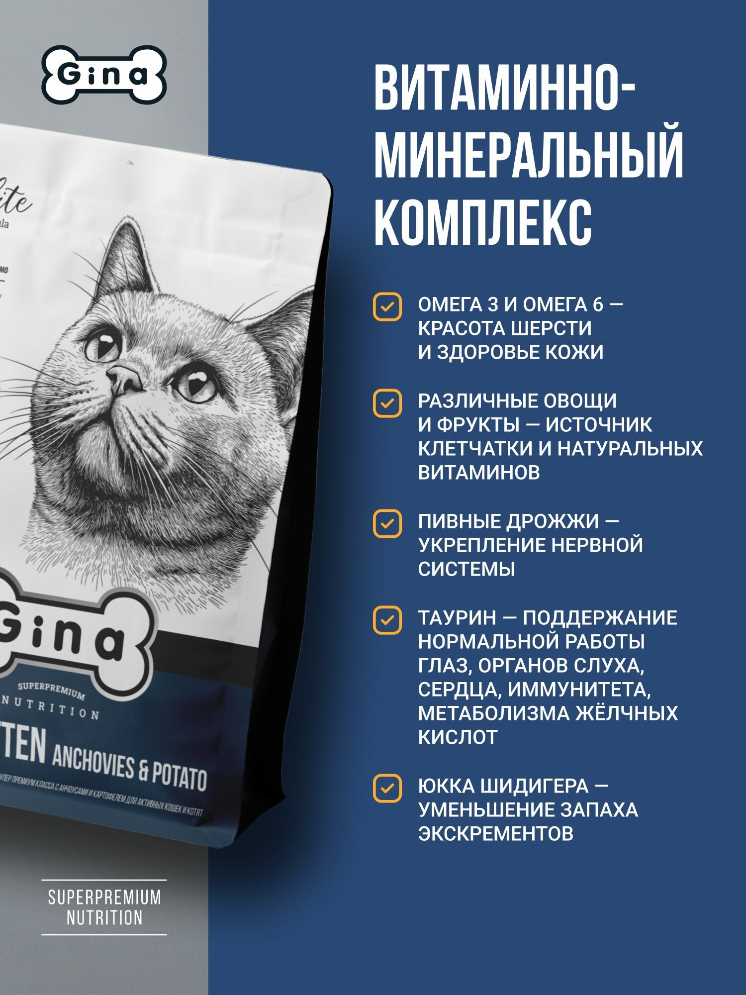 Купить Сухой корм для котят и кошек Gina Elite с анчоусом и картофелем, супер премиум, для активных и беременных, 1кг, Cat & Kitten Anchovies & Potato с доставкой по всей России.
