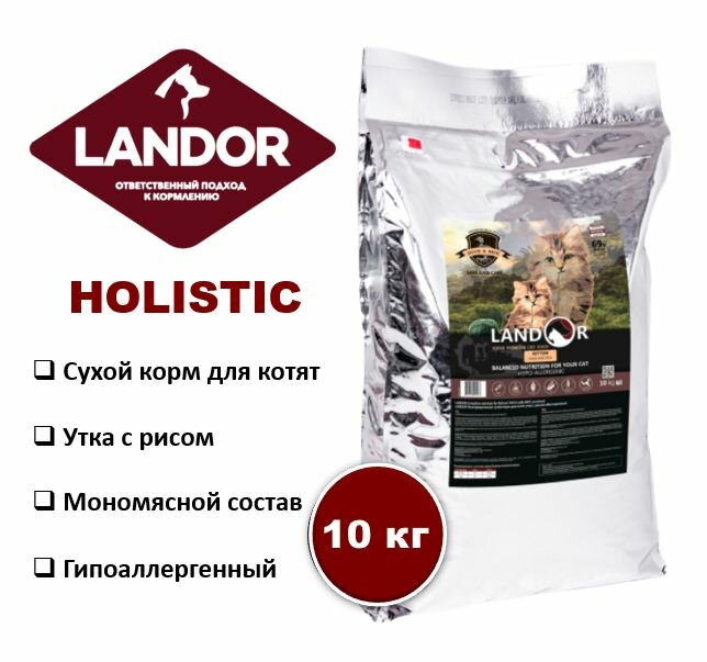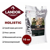 LANDOR KITTEN Полнорационный корм для котят утка с рисом. Для обеспечения нормального роста организма котенка необходим полноценный рацион питания, включающий в себя достаточное количество витаминов и минералов. Одним из основных и крайне важных ингредиентов рациона для домашнего питомца является мясо. Генетически семейство кошачьих всегда охотилось на птиц и лакомились ими, поэтому употребление в достаточном количестве мяса утки стабильно обеспечит здоровое развитие организма котенка. Содержащиеся в корме в большом количестве белки и аминокислоты создадут условия для здорового роста костных тканей и зубов взрослеющего питомца, сделают их крепкими и эластичными. Кроме того корм значительно укрепит иммунитет питомца и предотвратит желудочные расстройства.