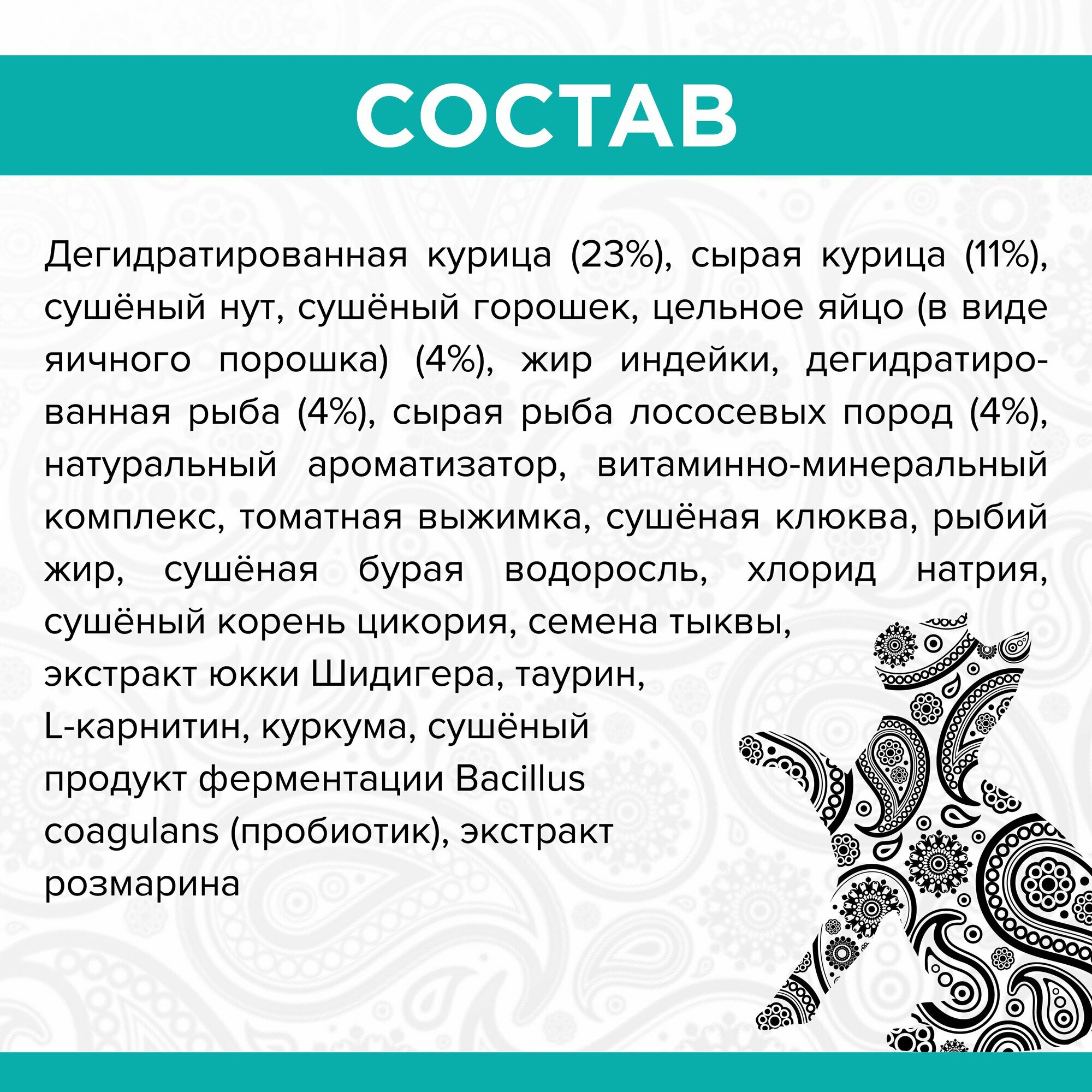 Куриное филе (16%), молотая курица (16%), сушеный нут, сушеный горох, мука из лосося, куриный жир (консервированный со смешанными токоферолами), льняное семя, лосось без косточек, натуральный ароматизатор, гороховый белок (удалено 8/1/18), томатная выжимка, сушеная клюква, кокосовое масло, сушеные водоросли, соль, витамины (добавка витамина Е, добавка ниацина, пантотенат D-кальция, ацетат витамина А, мононитрат тиамина, гидрохлорид пиридоксина, добавка рибофлавина, добавка витамина D3, биотин, добавка витамина B12, фолиевая кислота), сушеные яблоки , сушеная морковь, семена тыквы, экстракт юкки шидигера, хлорид кальция, минералы (сульфат железа, оксид цинка, карбонат кальция, оксид марганца, сульфат меди, хелат аминокислоты железа, хелат марганца, хелат цинка, хелат меди , селенит натрия, карбонат кобальта, этилендиамин дигидриодид), смешанные токоферолы, таурин, куркума, высушенный продукт ферментации Enterococcus faecium, высушенный продукт ферментации Lactobacillus acidophilus и высушенный продукт ферментации Lactobacillus casei, экстракт розмарина.
