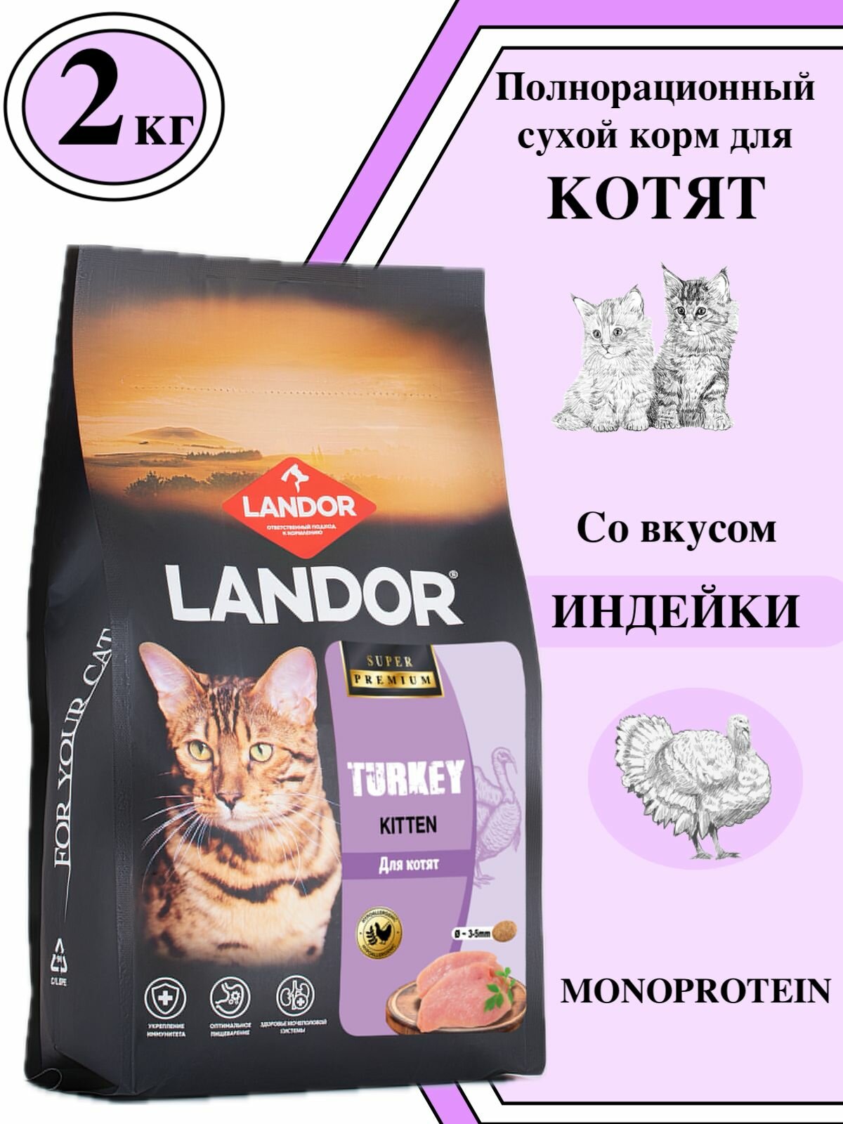 Монопротеиновый полнорационный Корм для котят сухой 2 кг индейка - это премиум корм супер класса для маленьких котят. Он разработан специально для повышенных потребностей маленьких котят и является идеальным выбором для полноценного питания вашего питомца. Корм содержит высокое содержание монобелка из индейки, что способствует формированию крепкого мускулатурного тела у котят. Это дает вашему малышу все необходимые питательные вещества для здорового роста и развития. Особенностью этого корма является его гипоаллергенная формула. Он идеально подходит для котят с чувствительностью к определенным продуктам питания или аллергией. Благодаря гипоаллергенной формуле, корм прекрасно усваивается организмом и не вызывает никаких негативных реакций. Вы можете быть уверены, что ваше маленькое чудо будет получать все необходимые питательные вещества, не страдая от аллергических реакций. Корм для котят сухой индейка разработан с учетом особых потребностей маленьких котят. В его составе присутствуют пребиотики, которые способствуют укреплению иммунной системы котят. Это особенно важно для малышей, которые только начинают знакомиться с окружающим миром и подвержены различным воздействиям. Корм обеспечивает их организм всеми необходимыми витаминами и минералами, что способствует укреплению иммунитета в самом раннем возрасте. Корм для котят сухой индейка также отличается высоким содержанием полезных жиров. Они являются источником энергии для маленьких котят и способствуют нормализации обмена веществ. Это особенно важно для котят, которые живут в условиях высокой активности, таких как игры и развлечения. Он позволяет им оставаться активными и здоровыми, не чувствуя усталости или слабости. Корм для котят сухой индейка идеально подходит для котят разных пород, в том числе британских и шотландских. Он особенно рекомендуется для взрослых котов с растительным и мясным содержанием. Благодаря своей уникальной формуле, корм обеспечивает насыщение организма кота всеми необходимыми питательными веществами и витаминами. Он имеет оптимальное соотношение белков, жиров и углеводов, что поддерживает здоровье вашего питомца на самом высоком уровне. Корм для котят сухойиндейка также рекомендуется для котов с пищеварительными проблемами, такими как чувствительность к пище или пищеварительные расстройства. Он содержит специальные ингредиенты, которые помогают улучшить пищеварение и усвоение питательных веществ. Благодаря этому, ваш кот будет чувствовать себя комфортно и иметь здоровый желудок без каких-либо неприятных симптомов. Корм для котят сухой индейка - это самый лучший выбор для вашего малыша. Он обеспечит ему все необходимое для полноценного питания и здорового развития. Вы можете быть уверены, что ваши малыши будут счастливы и здоровы, с блестящей шерстью и полным балансом жизни. Не откладывайте заботу о своих питомцах, выбирайте только самое лучшее - корм для котят сухой индейка!