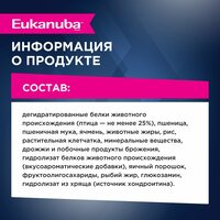 Профессиональное сбалансированное питание, специально разработанное с учетом особенностей собак крупных и очень крупных пород. Профессиональные рационы Eukanuba, разработанные специально для собак крупных пород старше 6 лет, содержат натуральные источники хондропротекторов ; глюкозамина и хондроитина, которые поддерживают здоровье суставов и хрящевой ткани. Особый баланс высококачественного животного белка и жира обеспечивает оптимальную калорийность рационов, что способствует поддержанию здорового веса и снижению чрезмерной нагрузки на суставы пожилой собаки. Рационы Eukanuba также содержат особую комбинацию из антиоксидантов, таких как витамин E и бета-каротин, и минералов, которые поддерживают иммунитет и нейтрализуют негативное воздействие окружающей среды, поддерживая естественную защиту организма собаки. Ингредиенты: Дегидратированные белки животного происхождения (домашняя птица) 26%, пшеница, ячмень, пшеничная мука, жир животный, рис, пульпа сахарной свеклы, минералы, сухое цельное яйцо, гидролизированный животный белок, высушенные пивные дрожжи, фрукто-олиго-сахариды, рыбий жир. Питательная ценность (в 100 г): Нутриенты Количество Белки 26 г Жиры 10 г Влажность 9 г Зола 7 г Клетчатка 2,2 г Кальций 1,17 г Фосфор 0,98 г Омега-6 жирные кислоты 1,47 г Омега-3 жирные кислоты 0,28 г Добавленные вещества (в 1 кг): Нутриенты Количество Витамин А 18000 ме/кг Витамин D3 1100 ме/кг Витамин Е 210 мг/кг Железо 172 мг/кг Йод 3,4 мг/кг Медь 15 мг/кг Марганец 72 мг/кг Цинк 183 мг/кг Селен 0,25 мг/кг L-карнитин 60 мг/кг Рекомендации по кормлению (суточная норма): Низкая активность, менее 1 часа в день Вес собаки, кг Вес еды, г 25 293 30 336 35 378 40 417 45 456 50 493 55 530 60 566 Вес собаки, кг Вес еды, г 65 601 70 635 75 669 80 702 85 735 90 767 95 798 100 830 Рекомендации по кормлению (суточная норма): Высокая активность, в течение 1-3 часов в день Вес собаки, кг Вес еды, г 25 386 30 443 35 497 40 549 45 600 50 650 55 698 60 745 Вес собаки, кг Вес еды, г 65 790 70 835 75 880 80 924 85 967 90 1009 95 1051 100 1092 * Вес взрослой собаки более 25 кг. При переходе на корм Eukanuba постепенно вводите его в рацион собаки в течение 4 дней. Мы рекомендуем кормить Вашу собаку 2 раза в день. Разделите дневную норму, указанную в таблице, на количество кормлений в день. Придерживайтесь рекомендуемых норм кормления, индивидуальная норма кормления Вашей собаки зависит от ее возраста, условий содержания, темперамента и активности. У собаки должна быть постоянно чистая и свежая вода для питья. Корм полнорационный и сбалансированный, поэтому дополнительное добавление витаминов или минералов в рацион собаки не требуется.