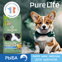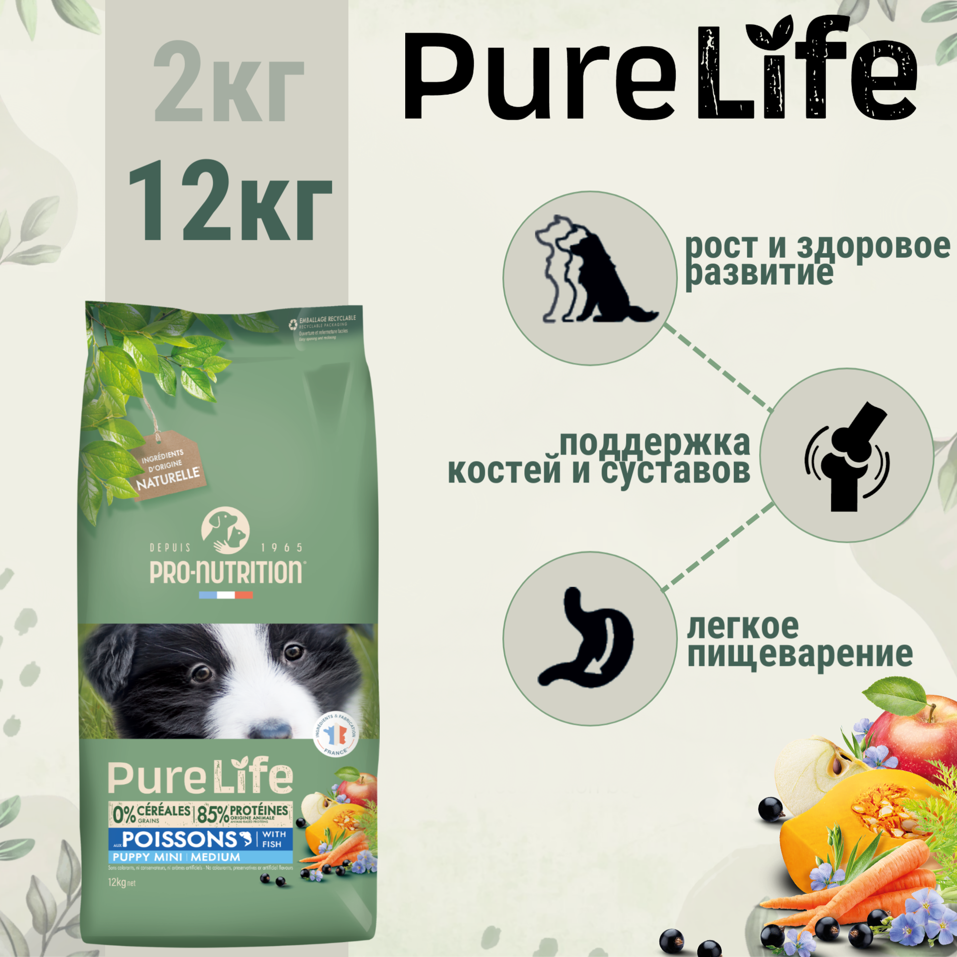 Сухой корм для щенков и собак Pro-Nutrition Flatazor Pure Life Puppy Mini/Medium с рыбой, беззерновой, для щенков с чувствительным пищеварением, Франция. Этот корм супер-премиум класса разработан специально для щенков с чувствительным пищеварением и беременных и кормящих собак. Основной ингредиент корма – рыба, а также гарнир из бобовых. В состав входят также батат, гороховый крахмал, гороховый протеин, картофельный крахмал, а также семена льна и рыбий жир.