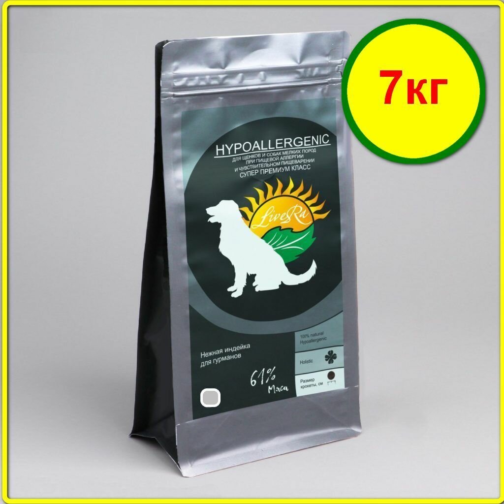 LiveRa Hypoallergenic - нежная индейка для гурманов. В основу корма Hypoallergenic положен особый подход к природным компонентам для создания натурального полнорационного питания категории холистик, принимающего во внимание все факторы жизни животного. При разработке корма Hypoallergenic , наша цель - решение проблем ослабленных систем организма. Кроме того, что мы серьезно относимся к определению и использованию тех ингредиентов, которые удовлетворяют физиологические потребности собак, мы еще руководствуемся принципами устойчивого развития питомца. Состав: дегидратированное мясо (индейка 30%, лосось 5%), рис цельный, гречка, жир лосося, сублимированная печень индейки, жир индейки, дрожжи (естественный источник MOS), пульпа сахарной свеклы, комплекс витаминов и минералов, свежие цельные яблоки, семя льна, комплекс пробиотиков (Bacillus subtilis и Bacillus licheniformis), топинамбур (источник ФОС), экстракт Юкки Шидигера, экстракт розмарина (натуральный антиоксидант), экстракт фенхеля, экстракт морских водорослей (фукуса). Гарантируемый анализ: сырой протеин 30%, сырой жир 16%, сырая зола 7,5%, сырая клетчатка 2,5%, кальций 1,6%, фосфор 1%, глюкозамин 300 мг/кг, хондроитин 100 мг/кг. Витамины: витамин А 16800 МЕ/кг, витамин D3 1600 МЕ/кг, витамин Е 160 МЕ/кг, витамин В1 12 мг/кг, витамин В2 14 мг/кг, витамин В6 6 мг/кг, витамин В12 60 мг/кг, никотиновая кислота 40 мг/кг, пантотеновая кислота 40 мг/кг, фолиевая кислота 4 мг/кг, холин 1920 мг/кг. Микроэлементы: калий 4,16 г/кг, селен 0,3 мг/кг, железо 100 мг/кг, марганец 30 мг/кг, цинк 120 мг/кг, медь 10 мг/кг, йод 4 мг/кг, бетаин 583,6 мг/кг.