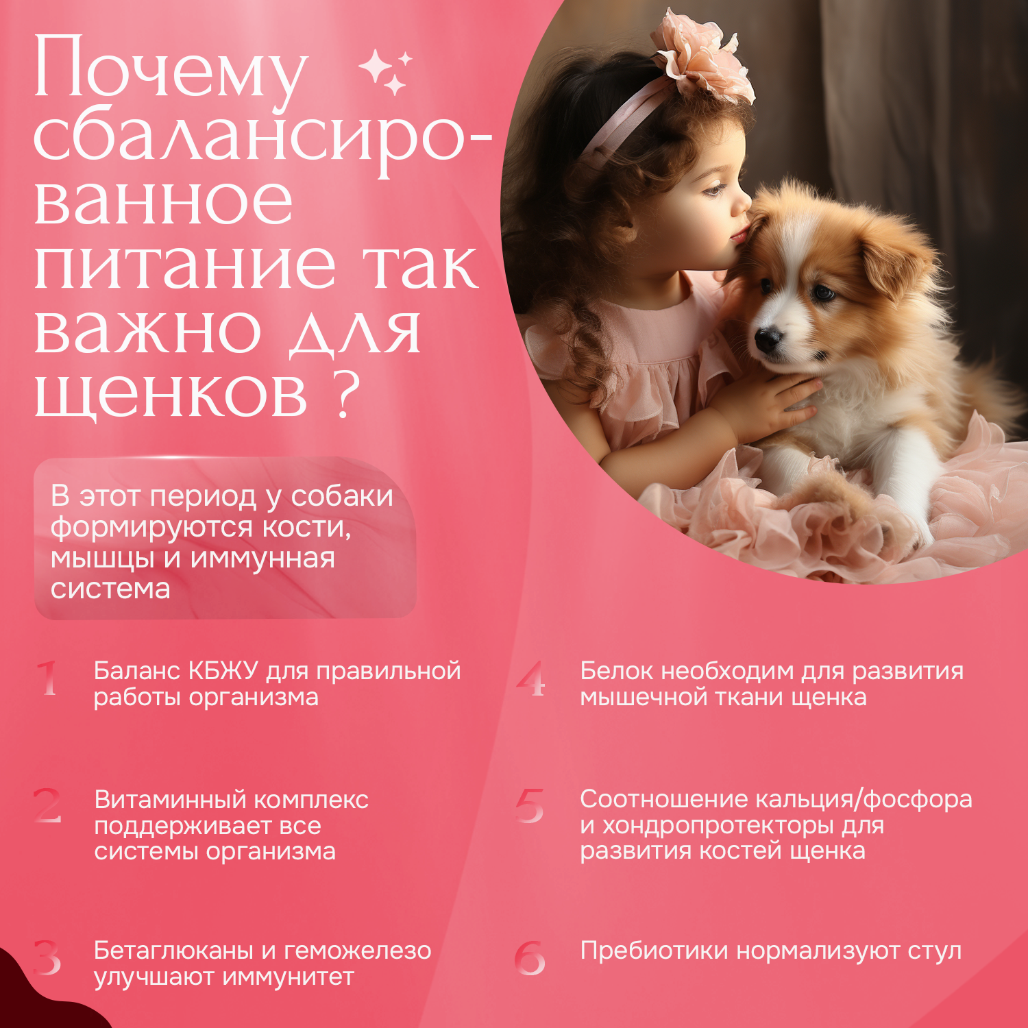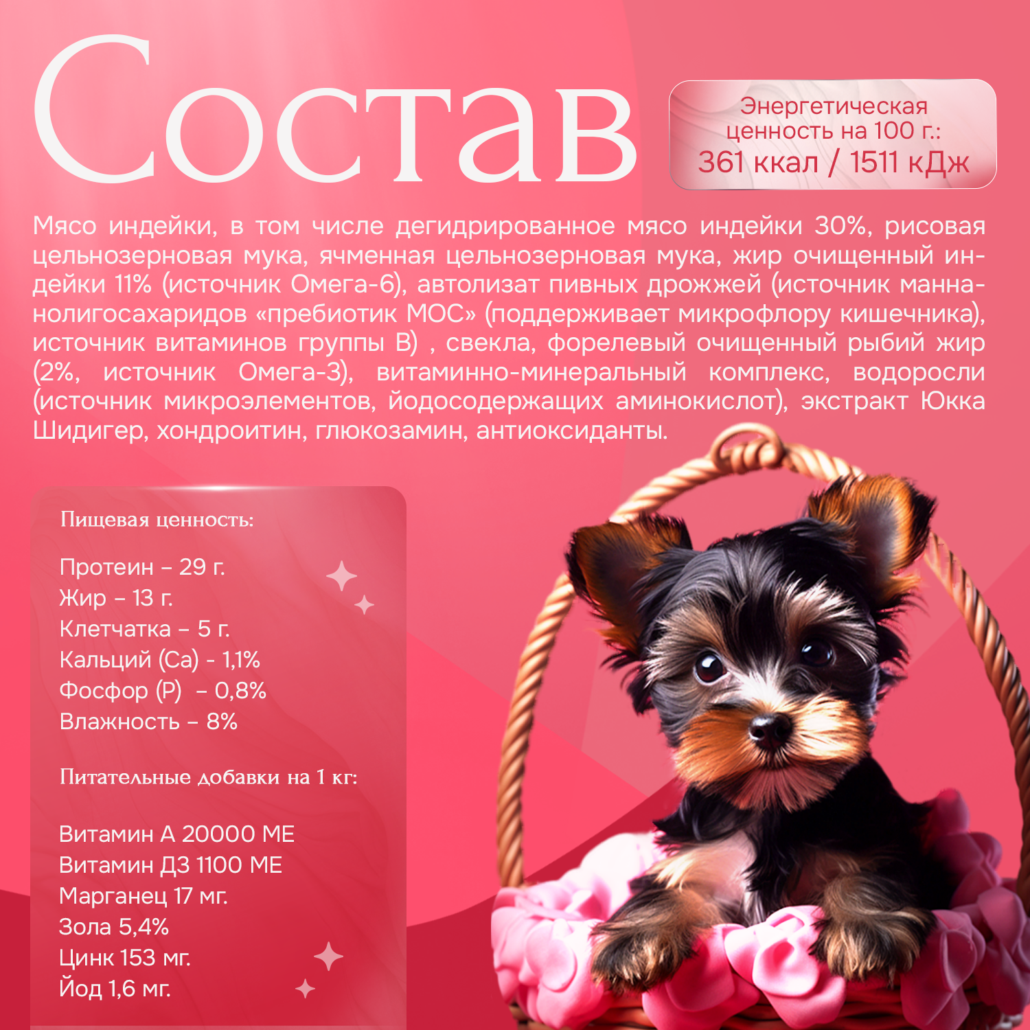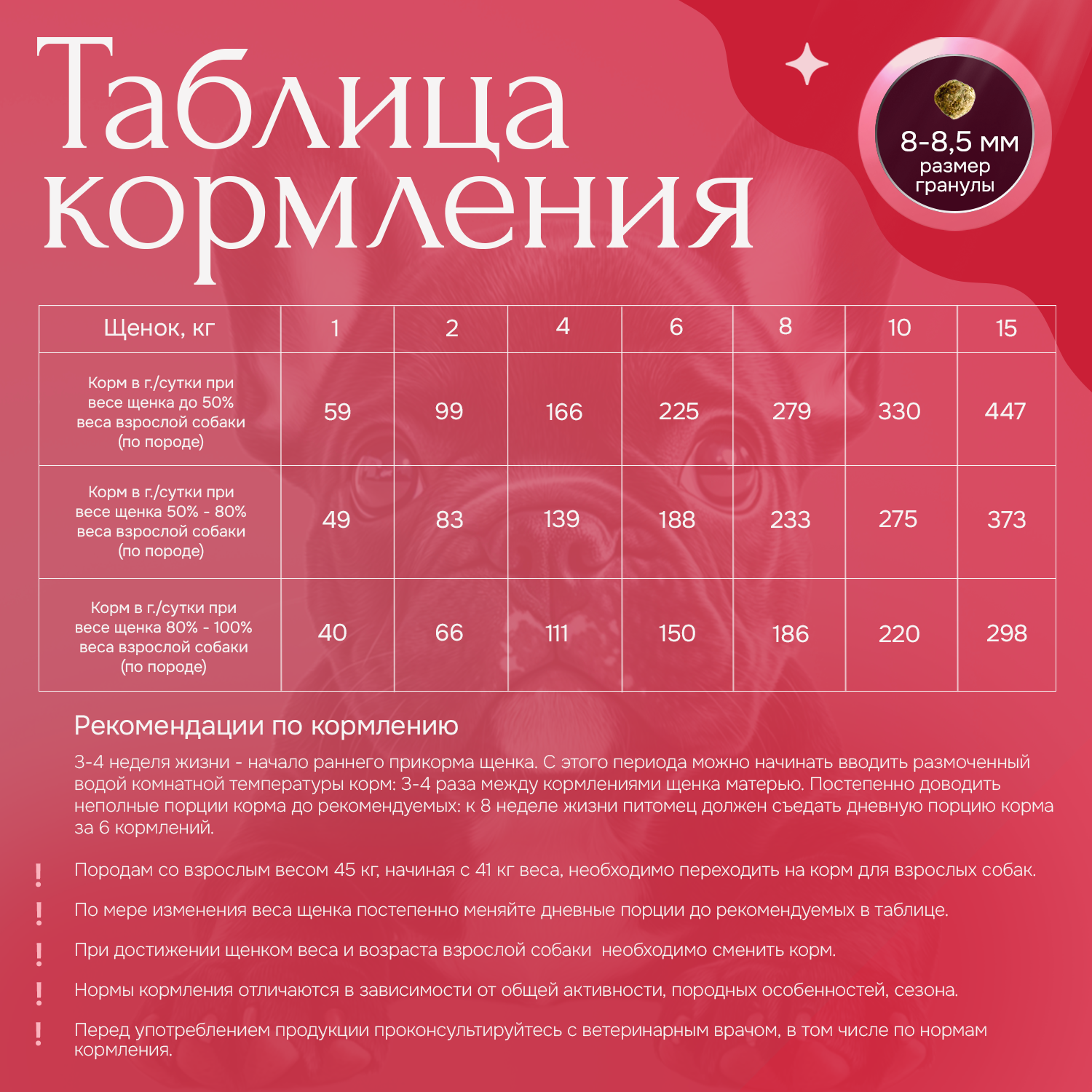 Корм подходит для беременных и кормящих собак, обеспечивая их организм всеми необходимыми питательными веществами для здорового развития потомства.
