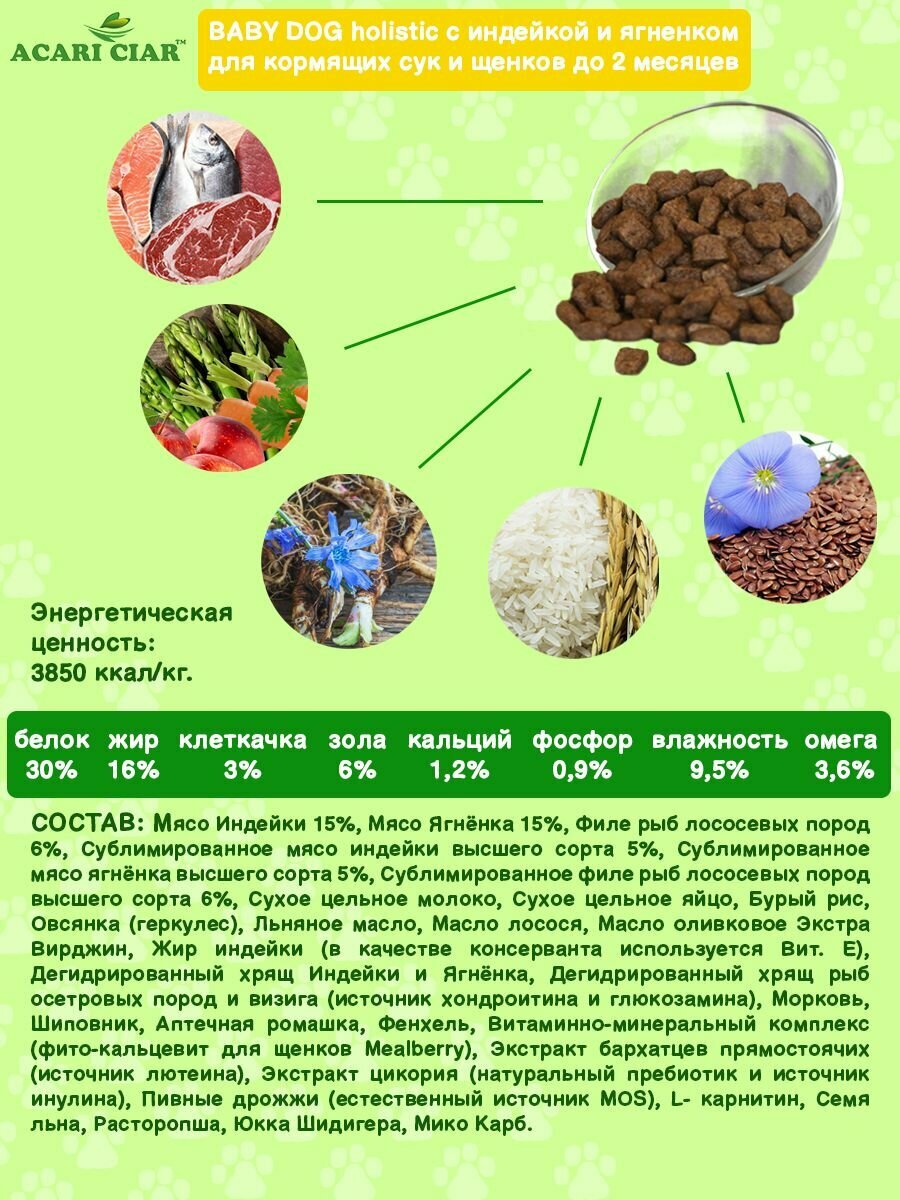 Кроме того, Acari Ciar Baby Dog содержит необходимое количество белка, жиров и углеводов, чтобы обеспечить правильное развитие мышц, поддерживать здоровую кожу и шерсть, а также поддерживать здоровье костей и зубов вашего щенка.