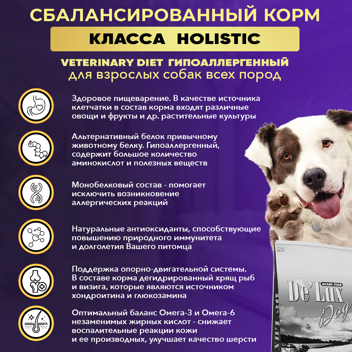 Сбалансированный сухой корм класса холистик на основе куколки тутового шелкопряда и личинки черной львинки для взрослых собак всех пород.