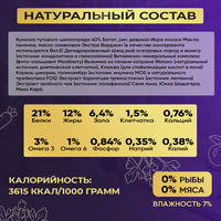 Белок – 21%, Жир – 12%, Клетчатка – 3,5%, Зола – 6,4%, Кальций – 0,76%, Фосфор – 0,84%, Натрий – 0,35%, Калий – 0,38%, Омега 3– 3%, Омега 6 – 1%, Влажность – 7%