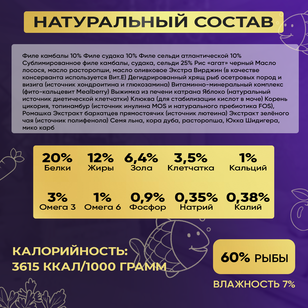 Белок – 20%, Жир – 12%, Клетчатка – 3,5%, Зола – 6,4%, Кальций – 1,26%, Фосфор – 0,76%, Натрий – 0,35%, Калий – 0,38%, Омега 3– 3,67%, Омега 6 – 1,4%, Влажность – 7%