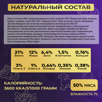 Белок – 21%, Жир – 12%, Клетчатка – 3,5%, Зола – 6,4%, Кальций – 0,76%, Фосфор – 0,84%, Натрий – 0,35%, Калий – 0,38%, Омега 3– 3%, Омега 6 – 1%, Влажность – 7%