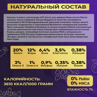 Белок – 20%, Жир – 12%, Клетчатка – 3,5%, Зола – 6,4%, Кальций – 1%, Фосфор – 0,9%, Натрий – 0,35%, Калий – 0,38%, Омега 3– 3%, Омега 6 – 1%, Влажность – 7%