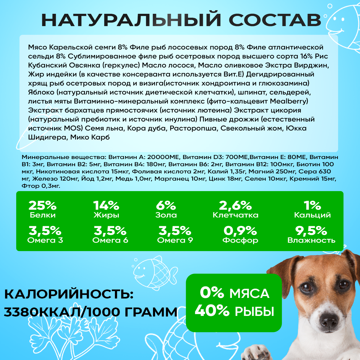 | Минеральные вещества | Мясо/рыба 0/40%, Протеин/Жир 25/14, Клетчатка 2,6%, Зола 6%, Кальций 1%, Фосфор 0,9%, Омега3/6/9 3,5%, Влажность 9,5%. |