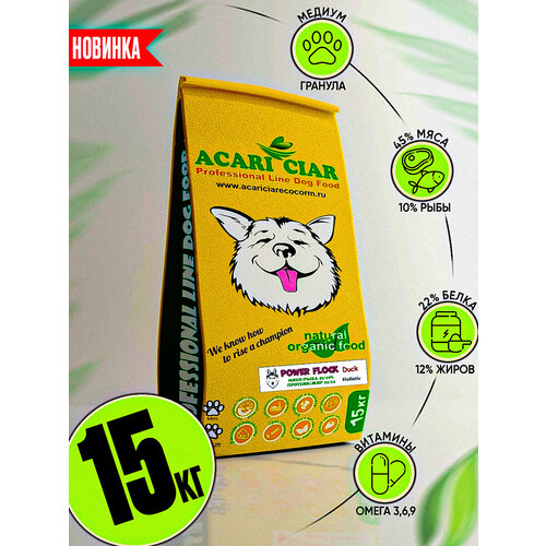 ACARI CIAR - здоровый и безопасный корм для домашних животных! Мы представляем беззерновой корм Acari Ciar Power Flock, который идеально подходит для собак, страдающих аллергией и чувствительностью к злакам. Он содержит только натуральные ингредиенты высшего качества. Разработка корма проводилась при участии ветеринарных врачей, кинологов и заводчиков России, что гарантирует его качество и соответствие потребностям домашних животных. Приобретите сухой корм Acari Ciar Power Flock для вашего питомца и убедитесь в его полезности и превосходном вкусе! Acari Ciar Power Flock – это беззерновой корм для собак, который сделает вашего четвероного друга здоровее и сильнее. Этот корм содержит только натуральные ингредиенты высокого качества: утку, кролика и филе лосося. Благодаря высокому проценту белков, Acari Ciar Power Flock повышает физическую выносливость и помогает поддерживать иммунную систему собаки в отличном состоянии. Acari Ciar Power Flock легко усваивается, а отсутствие искусственных красителей, консервантов и ароматизаторов делает его идеальным выбором для всех собак, в том числе для тех, которые склонны к аллергиям и пищеварительным расстройствам. В составе Acari Ciar Power Flock много питательных веществ, которые обеспечивают сбалансированное питание вашего питомца. Подарите своей собаке вкусный, здоровый и полезный корм – Acari Ciar Power Flock. Ингредиенты: Мясо утки 20%, Нутровка утки (сердце, печень, желудок) 15%, Нутровка кролика (почки, легкое, сердце, печень) 10%, Филе рыб лососевых пород 5%, Сублимированное филе рыб лососевых пород 5%, Батат 12%, Топинамбур 12%, Нут 12%, Дегидрированный хрящ ягненка (источник хондроитина и глюкозамина), Кокосовое масло 3%, Оливковое масло 3%, Утиный жир, Лососевое масло 3% (в качестве консерванта используется витамин Е), Витаминно-минеральный комплекс, Красный перец болгарский сладкий, Капуста пекинская, Кабачок, Банан, Груша, Расторопша, Экстракт бархатцев, Корень одуванчика, Ромашка (источник антиоксидантов), Корень цикория (источник MOS и FOS), L-карнитин, Семя льна, Кора дуба, Юкка Шидигера, Питательность: Мясо/Рыба 45/10%, Белок/Жир 22/12%, Клетчатка 2,8%, Зола 5,4%, Кальций 1,1%, Фосфор 0,78%, Омега 3/6/9 3,5%, Влажность 9,2%