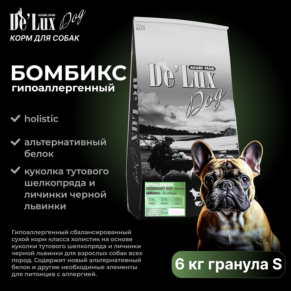 Гипоаллергенный сбалансированный сухой корм класса холистик на основе куколки тутового шелкопряда и личинки черной львинки для взрослых собак всех пород. Продукция ACARI CIAR - это натуральное и здоровое питание для четвероногих любимцев! Корма Акари Киар - созданы благодаря рекомендациям и советам ведущих ветеринарных врачей, кинологов и заводчиков России. В результате создан 100% натуральный, идеально сбалансированный, полнорационный корм для домашних животных. Наше предложение - сбалансированный гипоаллергенный сухой корм Acari Ciar Bombix класса холистик, который создан на основе натуральных ингредиентов высокого качества. Этот корм предназначен для взрослых собак всех пород, и в нем используются мениум и мини гранулы, что делает его идеальным для маленьких пород собак. Основой корма является куколка тутового шелкопряда и личинка черной львинки, которые обладают уникальными свойствами. Эти ингредиенты богаты омега-3 жирными кислотами, которые помогают поддерживать здоровье кожи и шерсти, а также витаминами Е и С, которые являются мощными антиоксидантами. Корм Акари Сиар Бомбикс класса холистик не содержит искусственных красителей, ароматизаторов и консервантов, а также зерна и сои, что делает его идеальным для собак с чувствительным желудком и кожей. Мы гарантируем, что наш корм обеспечит вашу собаку всем необходимым для здоровья и счастья, а также прекрасным вкусом и аппетитом. Попробуйте сбалансированный гипоаллергенный сухой корм Acari Ciar Bombix класса холистик уже сегодня и наслаждайтесь здоровым и счастливым питомцем! Питательность: Белок – 21%, Жир – 12%, Клетчатка – 3,5%, Зола – 6,4%, Кальций – 0,76%, Фосфор – 0,84%, Натрий – 0,35%, Калий – 0,38%, Омега 3– 3%, Омега 6 – 1%, Влажность – 7% Измеренная обменная энергия на 1 кг: 3615 ккал