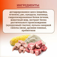 Дегидрированное мясо (индейка, ягненок), рис, кукуруза, пшеница, гидролизированные белки печени, животный жир, экстракт белка растительного происхождения (кукурузный глютен), пульпа сахарной свеклы (жом), дрожжи пивные, пребиотики.