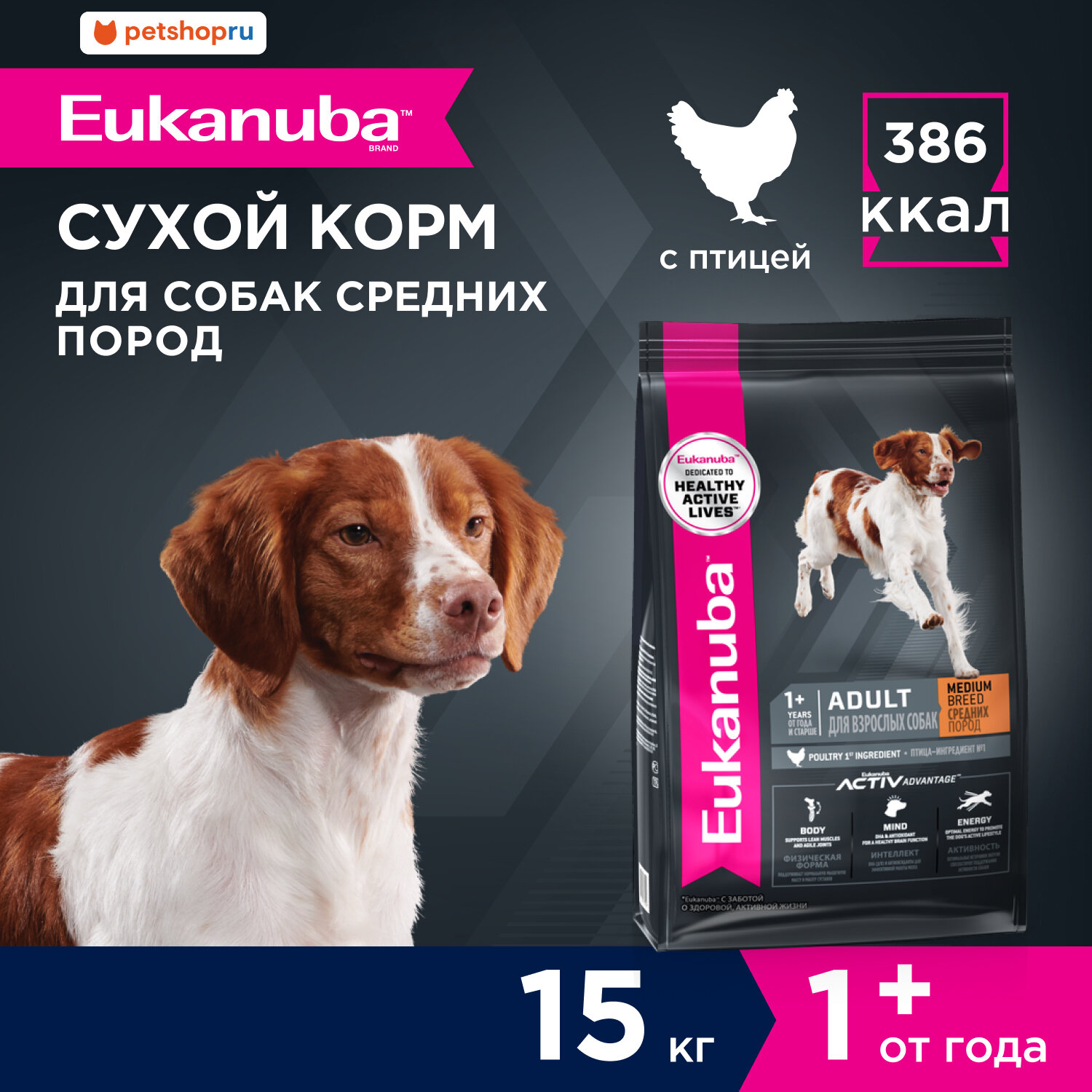 • Этот корм предназначен для: взрослых собак средних пород весом не более 24 кг в возрасте от 1 года.