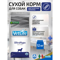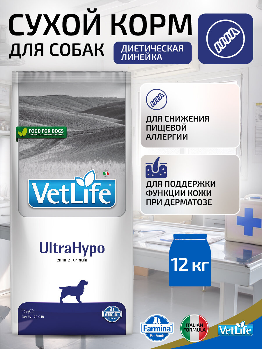 Farmina Vet Life UltraHypo диетический сухой корм для собак, разработанный для снижения пищевой непереносимости питательных веществ в случаях пищевой аллергии и атопий. Используется в качестве диагностического инструмента (исключающая диета). Диета также показана при атопических дерматитах и воспалительных состояниях кишечника.