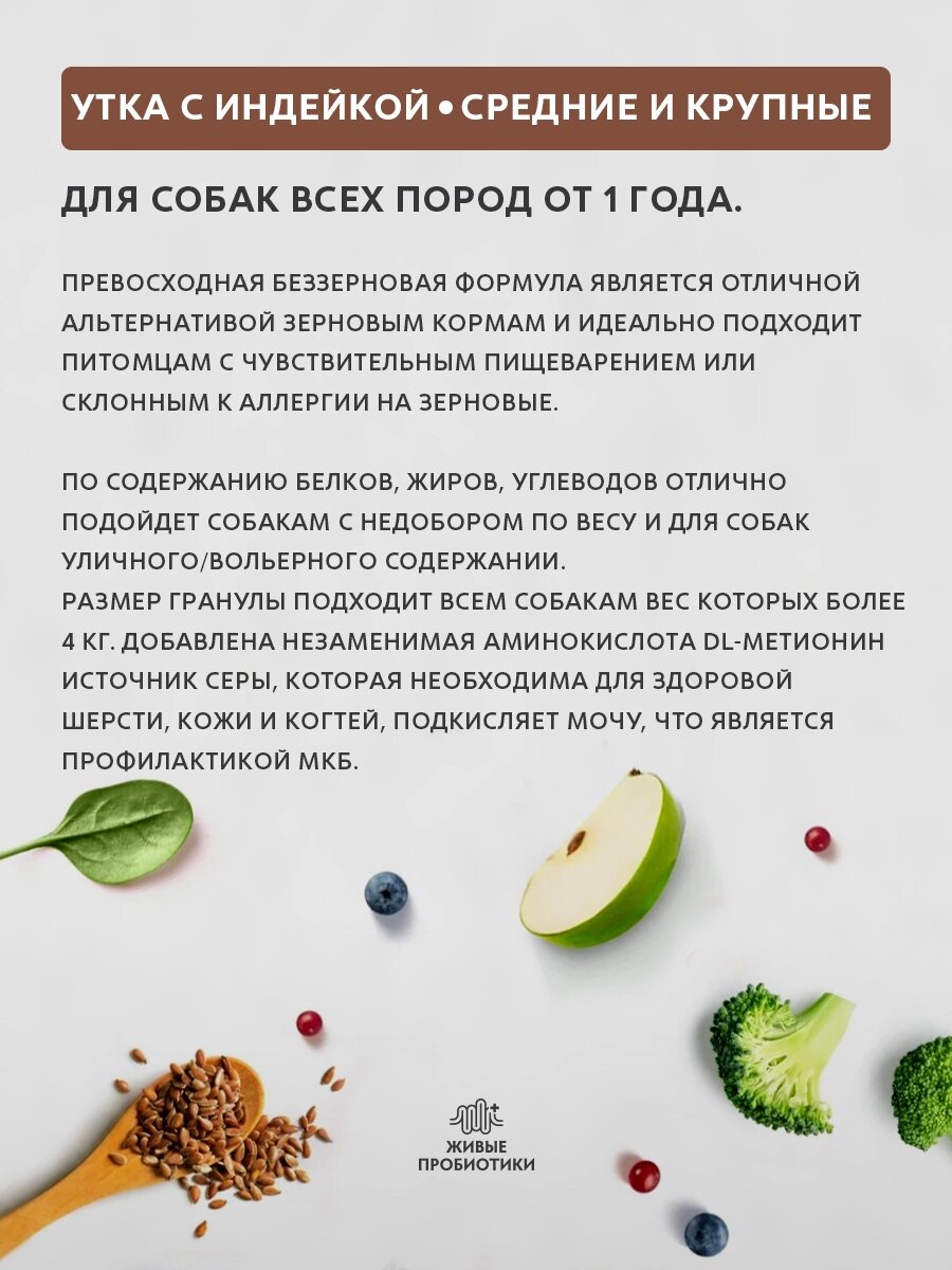 Беззерновой гипоаллергенный состав в сочетании с диетическим мясом утки и мясом индейки помогает предотвратить аллергические реакции и пищевую непереносимость, обеспечивая иммунное и пищеварительное здоровье.