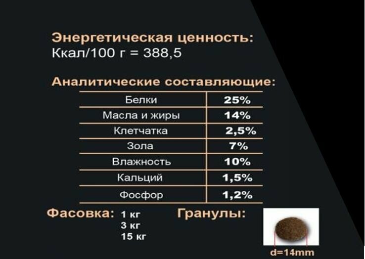 | Пищевая ценность | белки-25%, масла и жиры-14%, клетчатка-2,5%, зола-7%, влажность-10%, кальций-1,50%, фосфор-1,20% |