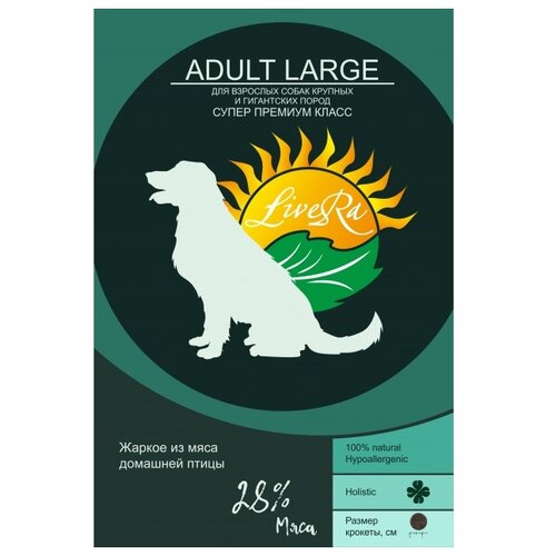 LiveRa ADULT LARGE - легко усваиваемый, полноценный рацион для взрослых собак крупных и гигантских пород, основанный на натуральных компонентах с добавлением необходимых витаминов и минералов. Сбор трав, входящий в состав корма, улучшает работу желудочно-кишечного тракта, поддерживает иммунитет способствует улучшению качества шерсти и состоянию кожи.