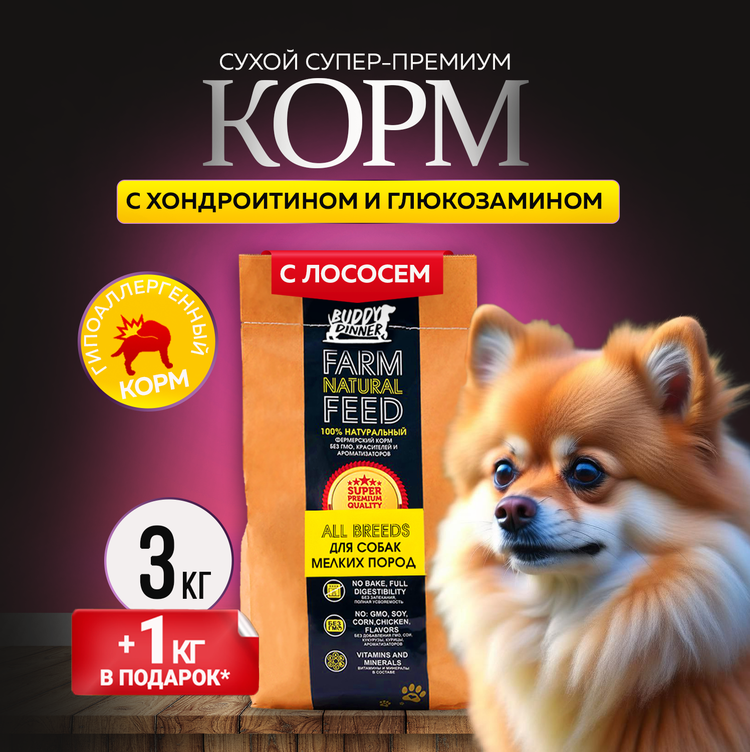 Сухой корм для собак с лососем представляет собой уникальное предложение среди супер премиум кормов для собак, предназначенное для тех, кто стремится обеспечить своего четырехногого друга исключительным качеством питания. Содержание мяса в этом корме составляет 61%, что делает его идеальным выбором для заботливых владельцев, желающих предоставить своему питомцу высокий уровень белка для полноценного питания. Лосось является не только великолепным источником высококачественного белка, но и обладает целым рядом других преимуществ для здоровья вашего питомца. Омега-3 и омега-6 жирные кислоты, содержащиеся в лососе, способствуют здоровью кожи и шерсти, поддерживая ее блеск и мягкость. Кроме того, лосось способствует здоровью сердечно-сосудистой системы и суставов, обеспечивая вашего питомца всеми необходимыми элементами для полноценной и активной жизни. Корм для собак с лососем разработан с учетом потребностей собак с чувствительным пищеварением. Полностью гипоаллергенный состав исключает возможность аллергических реакций, обеспечивая максимальную безопасность и комфорт для вашего питомца. Наш корм доступен в удобной упаковке весом 3 кг плюс 1 кг в подарок что делает его не только высококачественным, но и экономичным выбором для заботливых владельцев собак. Buddy Dinner Gold Line с лососем идеально подходит для представителей мелких пород, таких как шпиц, французский бульдог, чихуахуа, мопс, корги и других. Уникальная формула позволяет удовлетворить потребности даже самых капризных представителей маленьких пород. Корм с лососем производится в России с применением современных европейских технологий, соответствуя высоким международным стандартам и ГОСТ, что гарантирует надежность и безопасность продукта. Наши корма обогащены большим витаминным комплексом, специально разработанным для поддержания здоровья, энергии и активности вашего питомца. Регулярное потребление корма Buddy Dinner с лососем способствует развитию вашей собаки, обеспечивая ей крепкое здоровье и долгую активную жизнь.