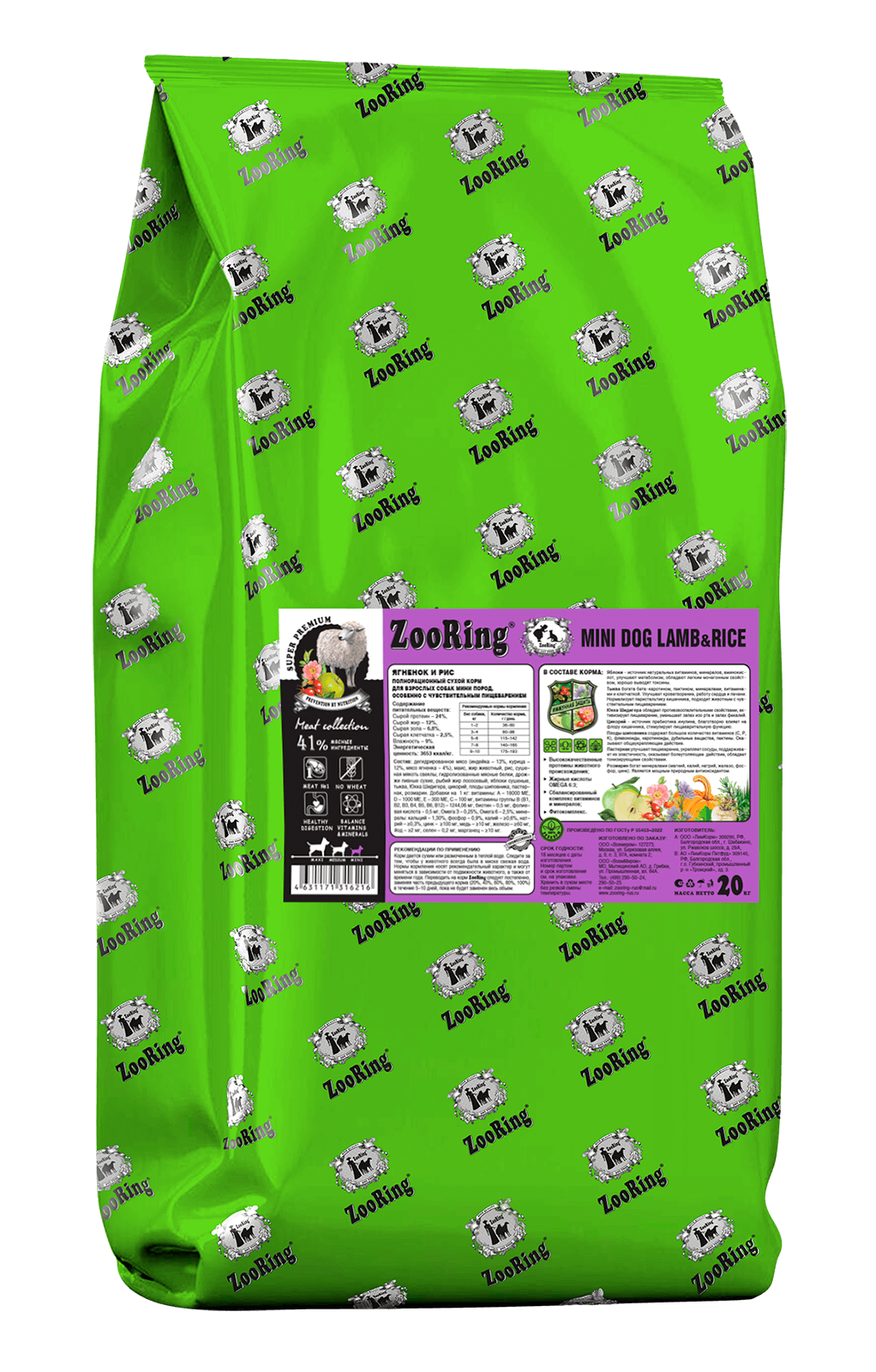 ZooRing корм холистик для собак сбалансирован по витаминам, минералам и аминокислотам - укрепляет иммунитет, обеспечивает правильное развитие, отличное пищеварение, хорошее состояние кожи, блестящую шерсть, крепкие зубы и кости.