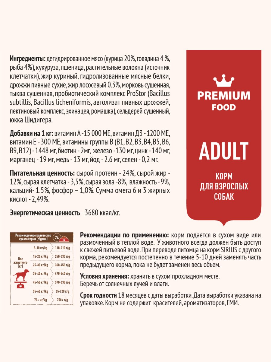 Корм SIRIUS «Мясной рацион» премиум класса.