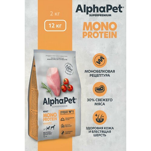 Корм для взрослых собак средних и крупных пород AlphaPet Superpremium Monoprotein – это полнорационный корм для собак со индейки. Корм для собак суперпремиум изготовлен по самым высоким стандартам качества и содержит большой процент животного белка. В состав корма входит свежее мясо, которое обеспечивает высокую вкусовую привлекательность питания. Индейка в рационе Вашего питомца – быстроусвояемый белок, богатый фосфором и железом. Подходит для диетического питания, но в то же время полноценно насыщает организм питомца. За счет монобелковой рецептуры, для взрослых собак корм сухой подходит животным с пищевой непереносимостью, а значит может использоваться как гипоаллергенный корм для собак. Корм для собак сухой изготавливается по бережной технологии, сохраняя вкусовые и питательные свойства свежего мяса. Для приготовления корма используются ингредиенты, которые пригодные в пищу человеку (уровень Human Grade). Уникальный комплекс натуральных добавок AlphaPetBIO (зеленогубый моллюск, календула, одуванчик, льняное семя, цикорий, клюква, юкка Шидигера, розмарин) содержит компоненты, которые поддерживают оптимальный обмен веществ, иммунные свойства организма, естественную микрофлору кишечника, здоровье опорно-двигательной системы, здоровье пищеварительной и мочеполовой систем. Оптимальное содержание полиненасыщенных жирных кислот Омега-3 и Омега-6 (омега для собак), обеспечивает поддержание здоровья кожи и блеска шерсти. Еда для собак изготавливается по низкозерновой рецептуре, и не содержит пшеницу, кукурузу и глютен. Корм для собак сухой содержит только натуральные ингредиенты (мясо, злаки, овощи и травы), не содержит ГМО, искусственные красители и ароматизаторы. Собачий корм можно давать как корм для собак средних пород и корм для собак крупных пород. Так, Вы можете применять питание для собак как корм для немецкой овчарки, корм для лабрадора. Если Вы ищите корм для хаски, то также можете рассмотреть данный рацион. Сухой корм для взрослых собак средних и крупных пород AlphaPet Superpremium Monoprotein – это здоровый и активный питомец!